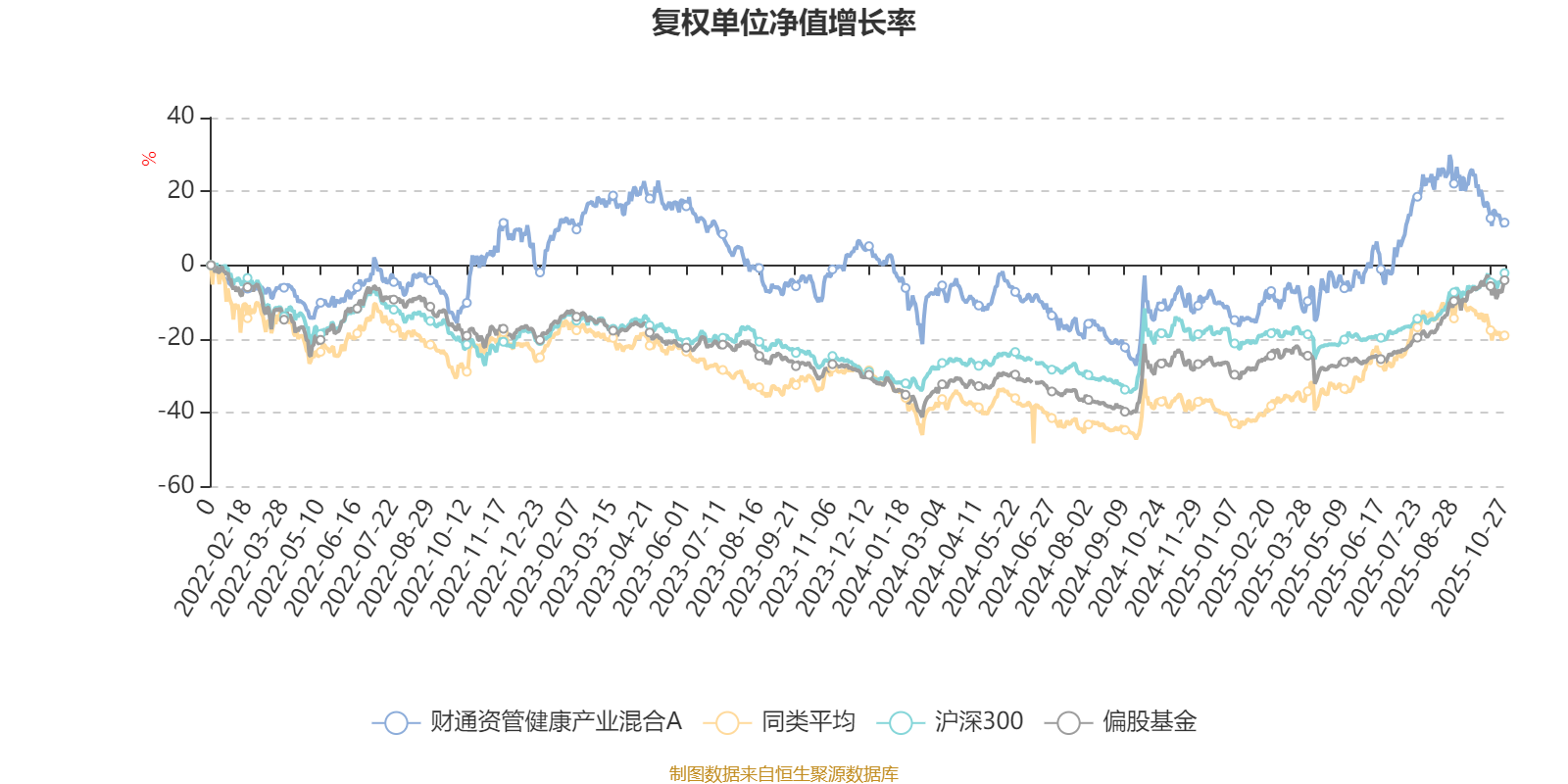截至10月27日,财通资管健康产业混合A近三个月复权单位净值增长率为-6.29%,位于同类可比基金79/106;近半年复权单位净值增长率为18.24%,位于同类可比基金71/104;近一年复权单位净值增长率为24.92%,位于同类可比基金58/101;近三年复权单位净值增长率为8.85%,位于同类可比基金34/75。