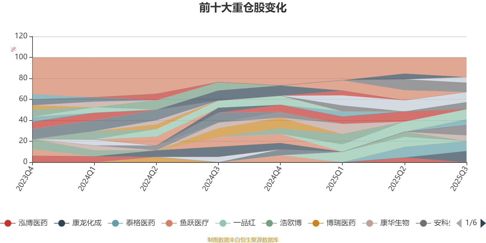 该基金持股集中度较高,近2年前十大重仓股集中度长期超过60%。截至2025年三季度末,基金十大重仓股分别是康龙化成、安科生物、康弘药业、热景生物、泰格医药、昭衍新药、恒瑞医药、西藏药业、康华生物、汇宇制药。