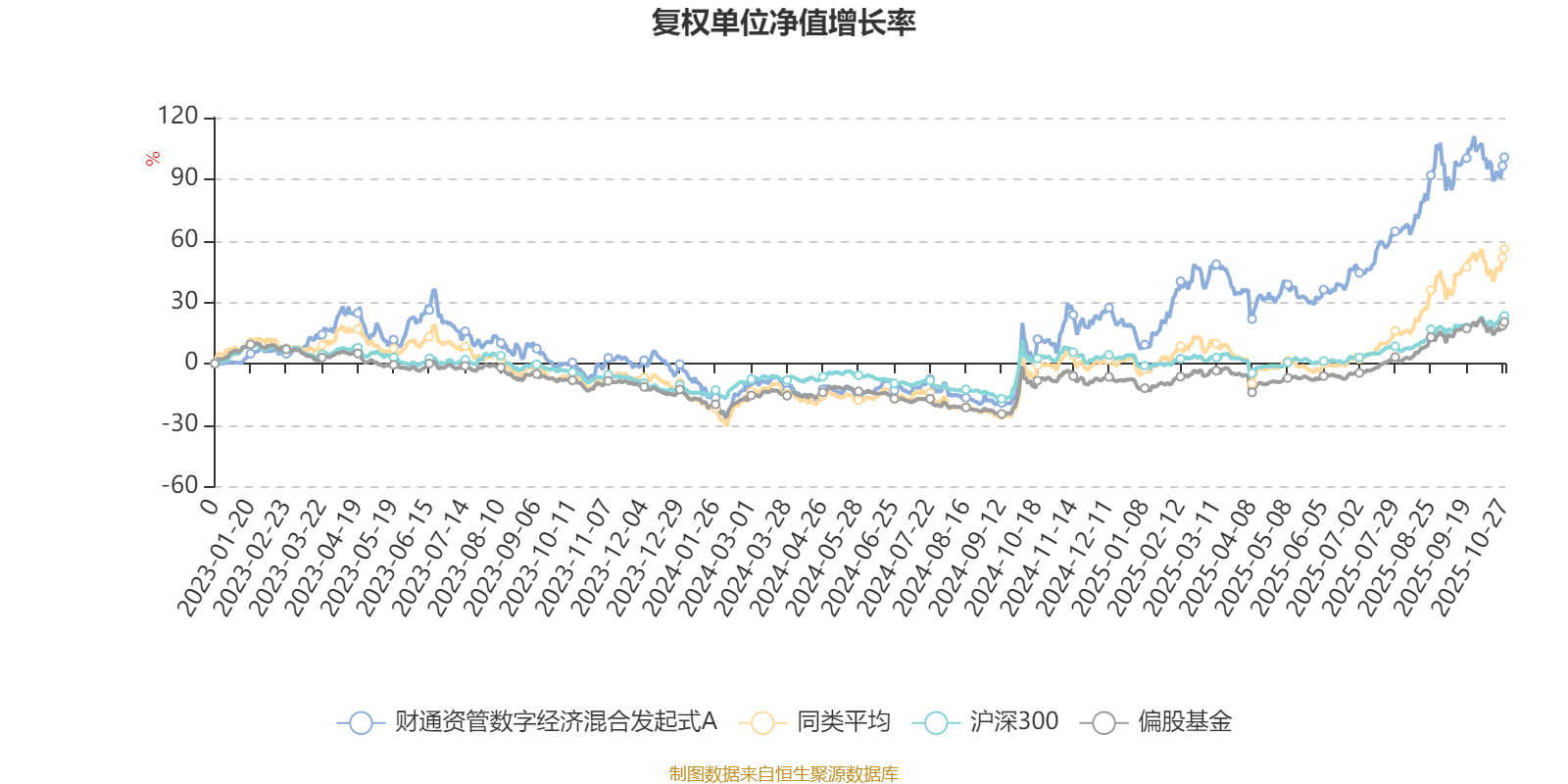 截至10月27日,财通资管数字经济混合发起式A近三个月复权单位净值增长率为22.98%,位于同类可比基金172/229;近半年复权单位净值增长率为52.55%,位于同类可比基金114/229;近一年复权单位净值增长率为80.29%,位于同类可比基金35/213。
