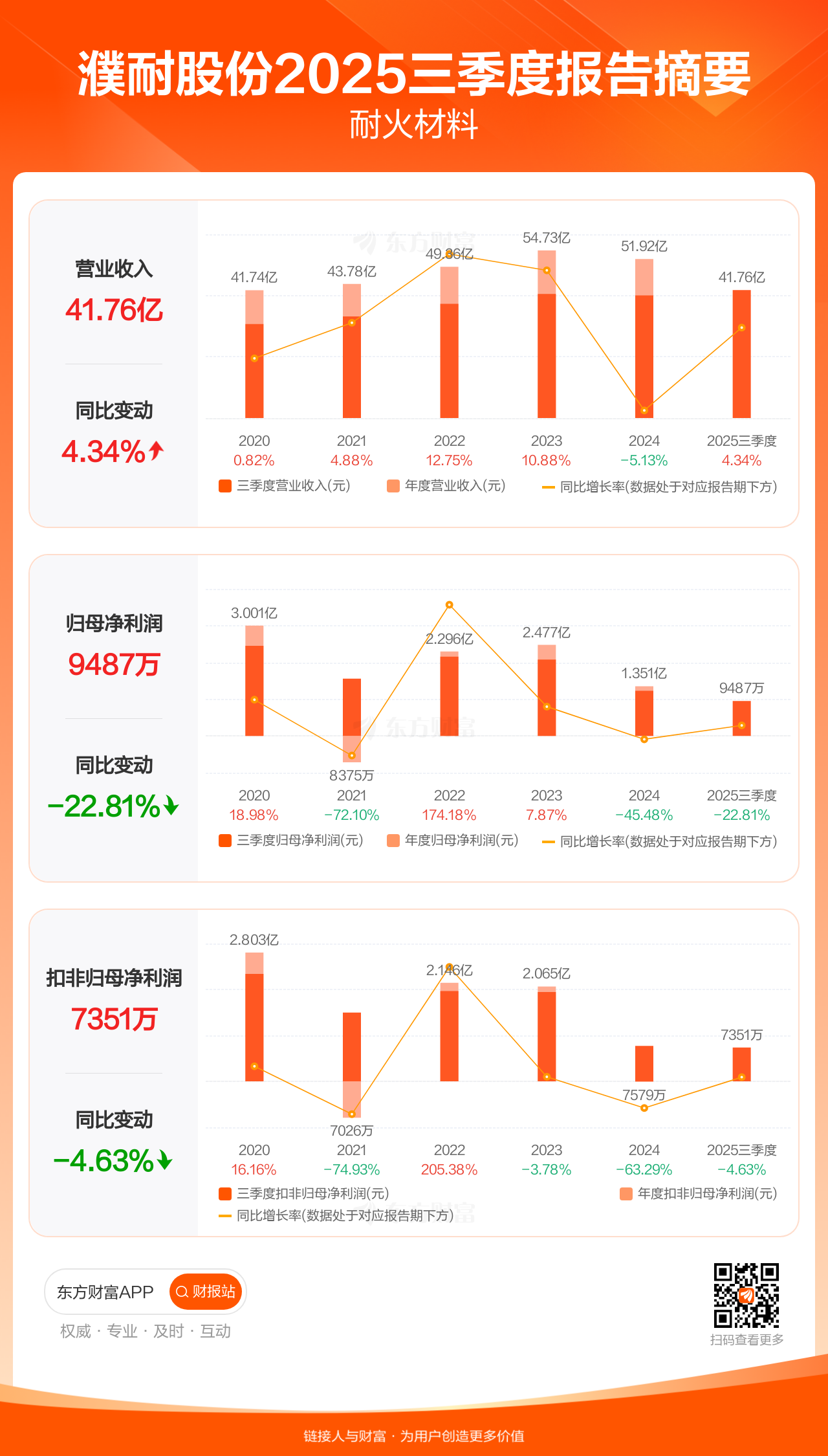 濮耐股份10月27日发布2025年三季报显示,公司前三季实现营业收入41.76亿元,同比增长4.34%;归母净利润9486.59万元,同比下滑22.81%;扣非归母净利润7350.99万元,同比下滑4.63%。