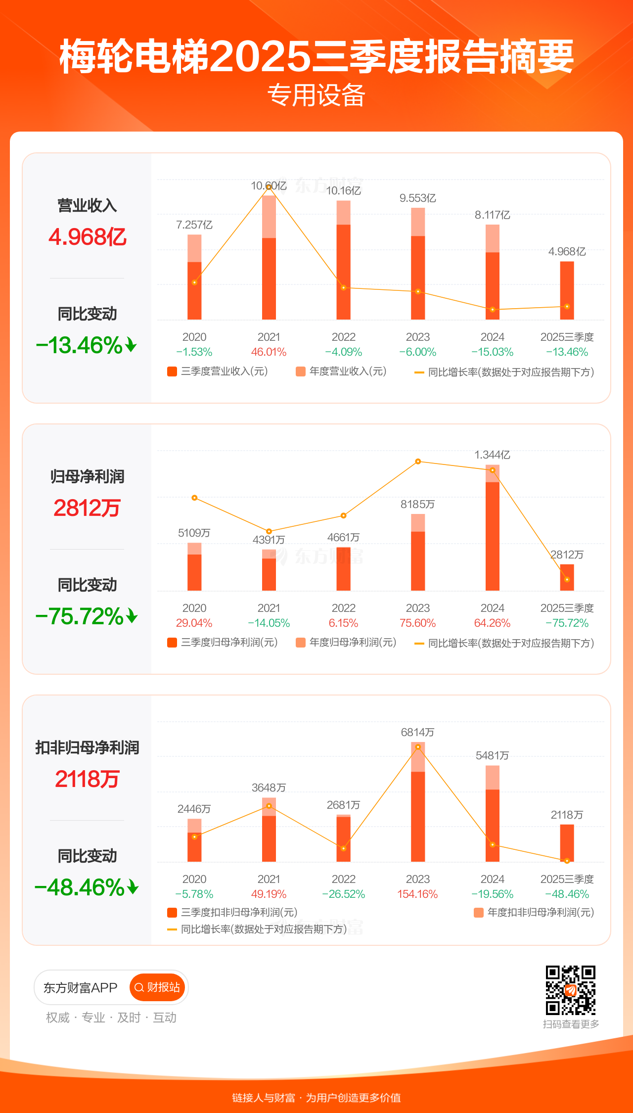 梅轮电梯10月29日发布2025年三季报显示,公司前三季实现营业收入4.97亿元,同比下滑13.46%;归母净利润2811.86万元,同比下滑75.72%;扣非归母净利润2117.99万元,同比下滑48.46%。