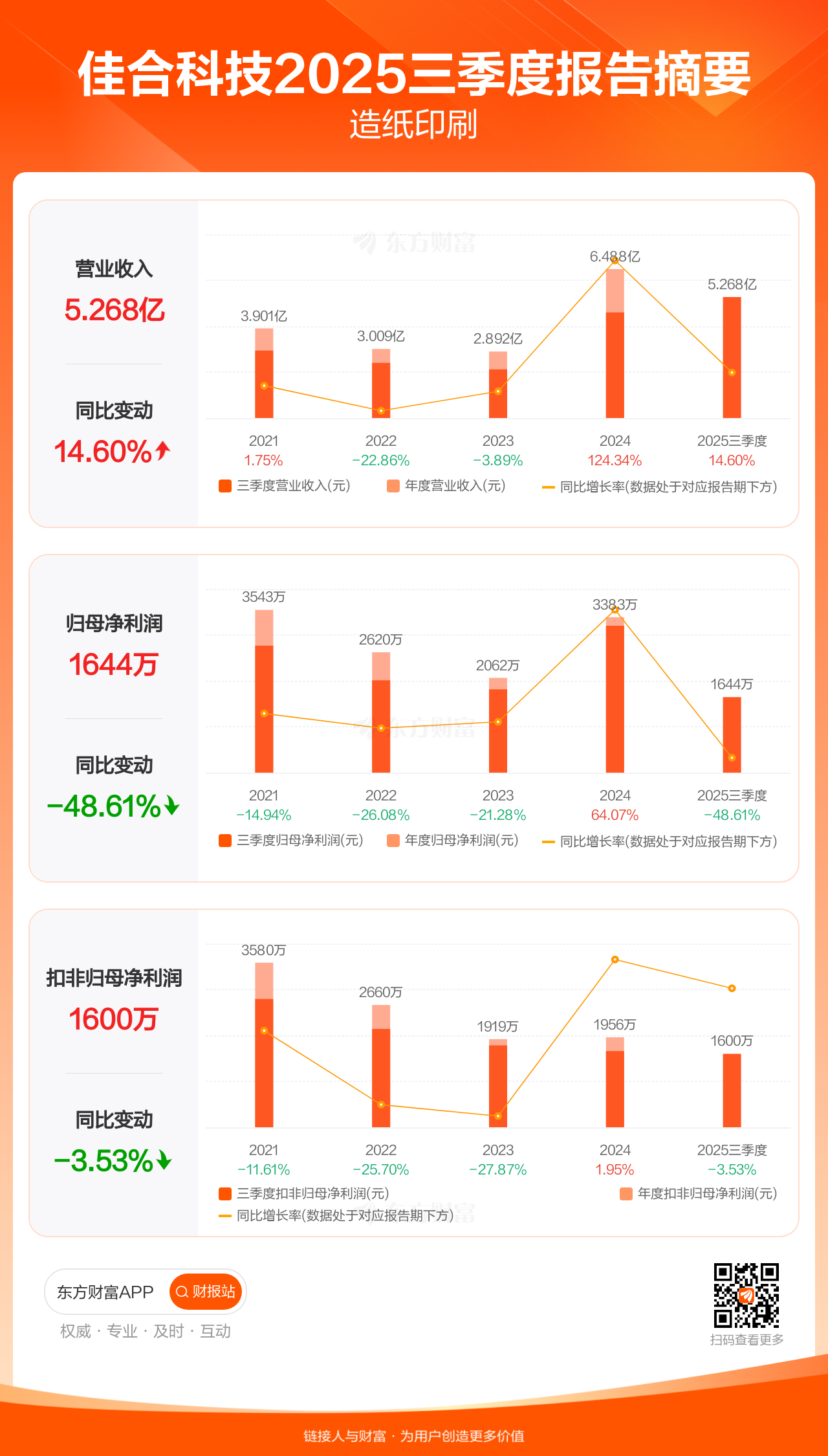 佳合科技10月28日发布2025年三季报显示,公司前三季实现营业收入5.27亿元,同比增长14.60%;归母净利润1643.85万元,同比下滑48.61%;扣非归母净利润1600.01万元,同比下滑3.53%。