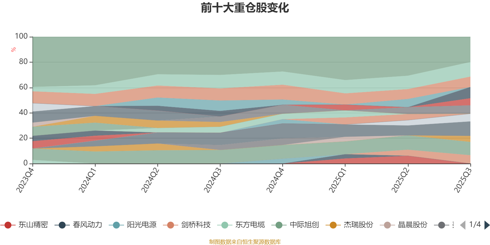 该基金持股集中度较高,近2年前十大重仓股集中度长期超过60%。截至2025年三季度末,基金十大重仓股分别是新易盛、宁德时代、中际旭创、工业富联、新产业、剑桥科技、沪电股份、生益科技、亿纬锂能、杰瑞股份。