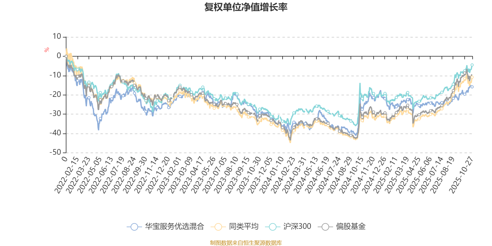 截至10月27日,华宝服务优选混合近三个月复权单位净值增长率为8.30%,位于同类可比基金217/265;近半年复权单位净值增长率为12.85%,位于同类可比基金240/265;近一年复权单位净值增长率为11.42%,位于同类可比基金238/265;近三年复权单位净值增长率为18.49%,位于同类可比基金132/253。