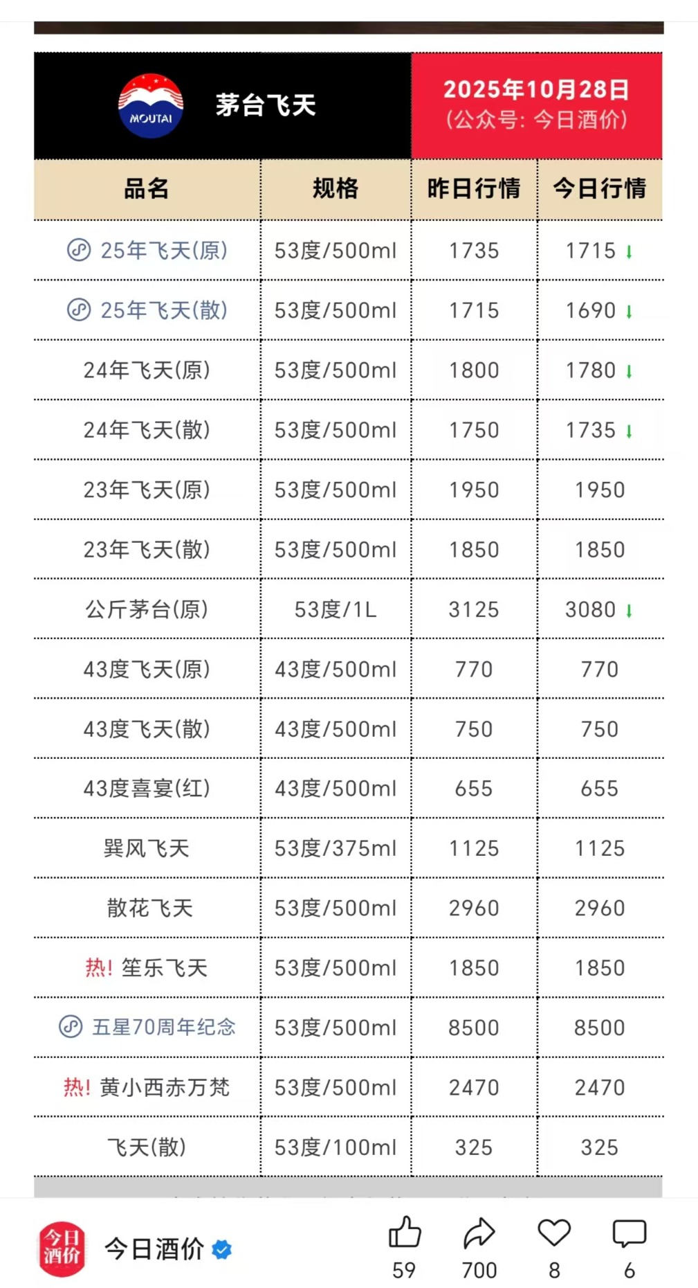 茅台“神性”再有减弱!酒类行情监测平台“今日酒价”微信公众号10月28日数据显示,2025年53度500ml飞天茅台散瓶批发参考价报1690元,较前一日下跌25元,首次跌破1700元/瓶大关,再创上市以来的新低;原箱报1715元,较前一日下跌20元。