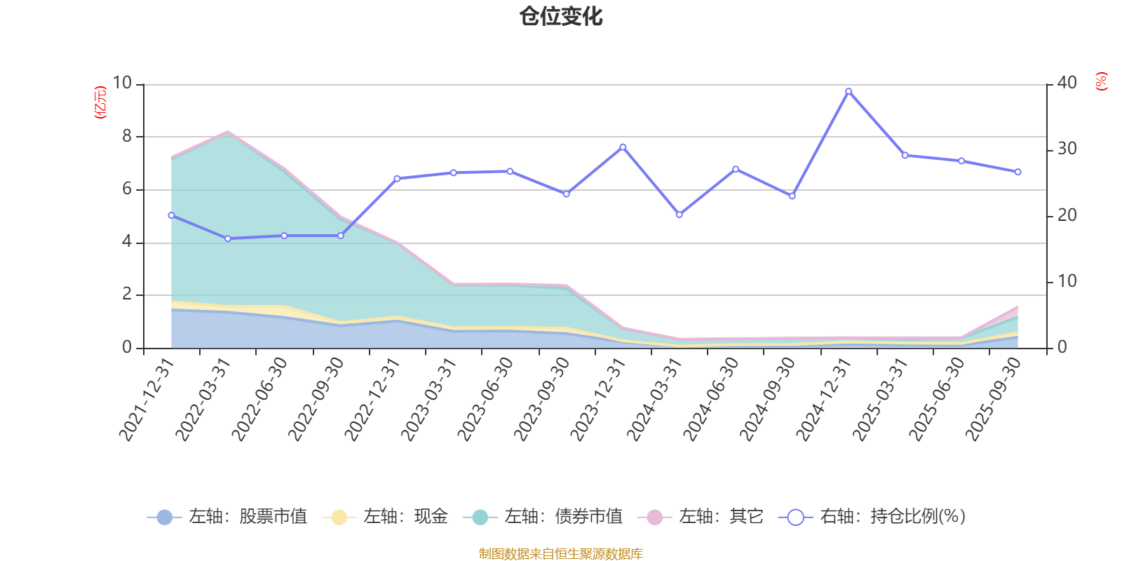 据定期报告数据统计,近三年平均股票仓位为27.21%,同类平均为19.14%。2024年末基金达到38.93%的最高仓位,2022年一季度末最低,为16.6%。