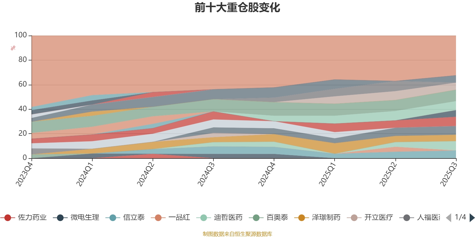 截至2025年三季度末,基金十大重仓股分别是恒瑞医药、迪哲医药、百济神州、百利天恒、诺诚健华、信立泰、海思科、新诺威、药明康德、泽璟制药。