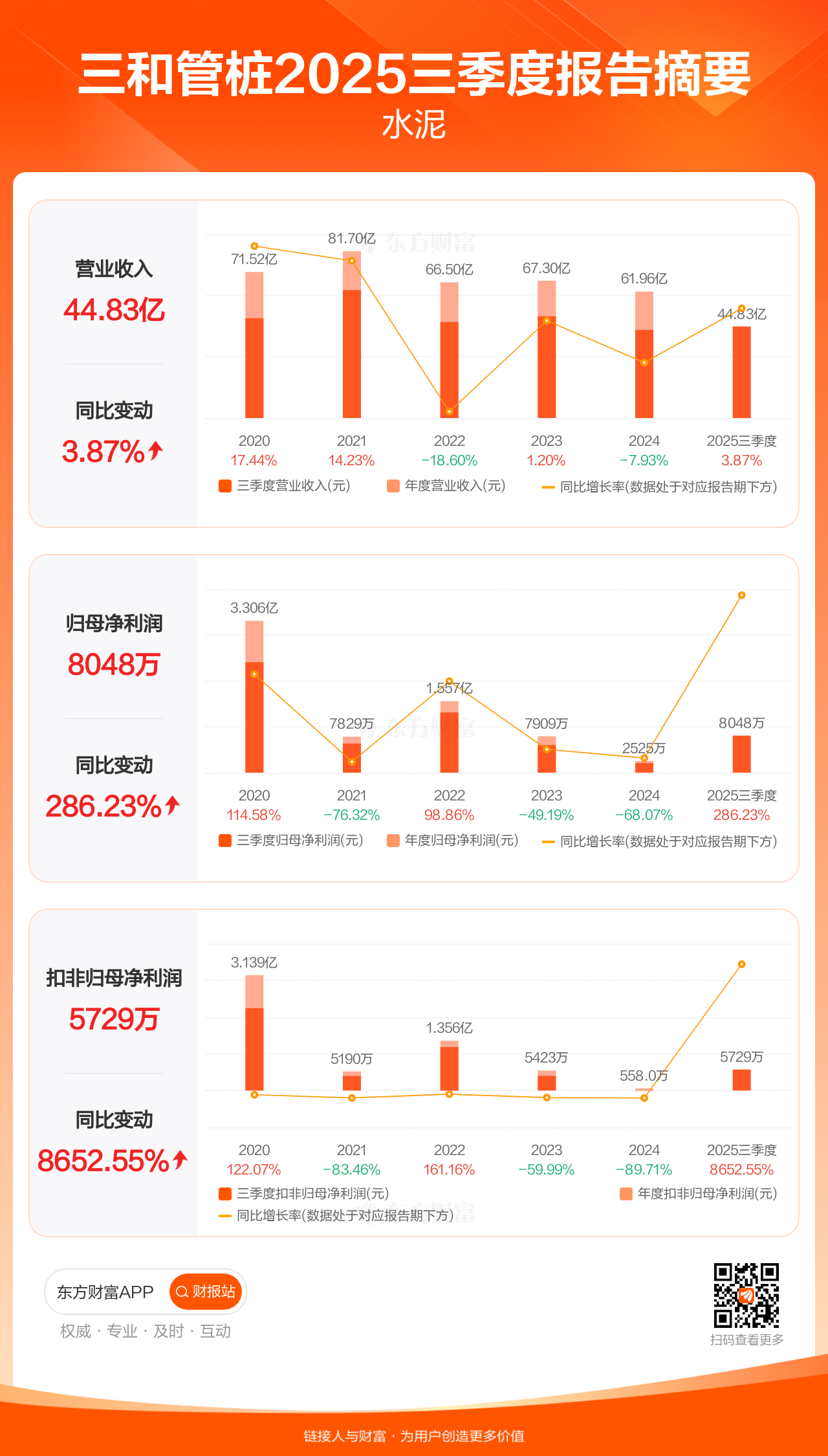 三和管桩10月29日发布2025年三季报显示,公司前三季实现营业收入44.83亿元,同比增长3.87%;归母净利润8047.71万元,同比增长286.23%;扣非归母净利润5728.69万元,同比增长8652.55%。