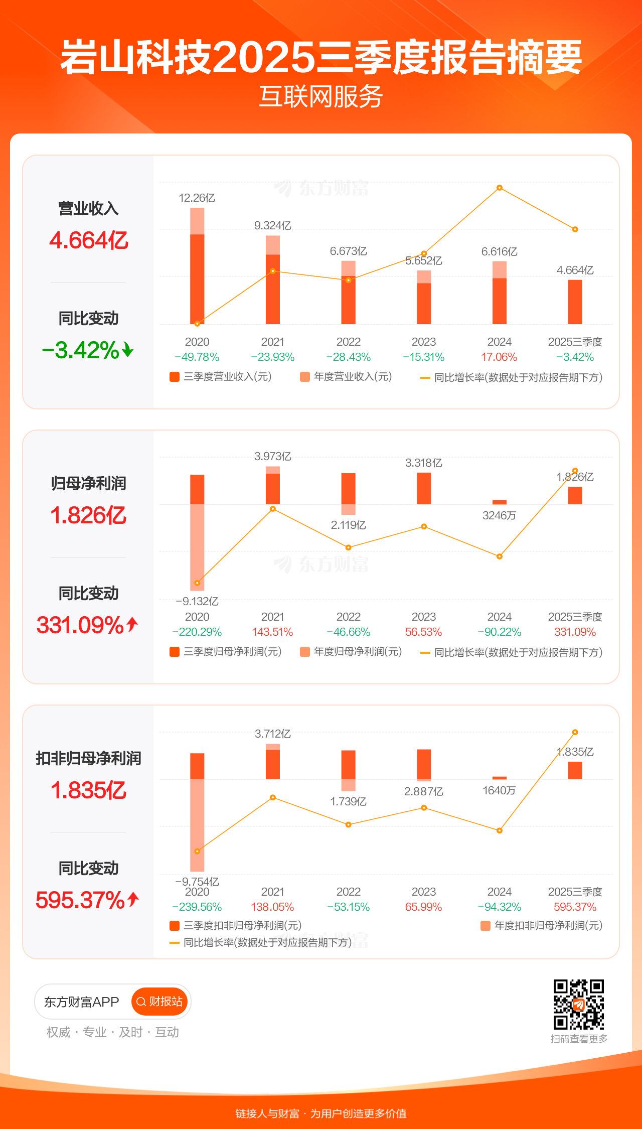岩山科技10月29日发布2025年三季报显示,公司前三季实现营业收入4.66亿元,同比下滑3.42%;归母净利润1.83亿元,同比增长331.09%;扣非归母净利润1.84亿元,同比增长595.37%。