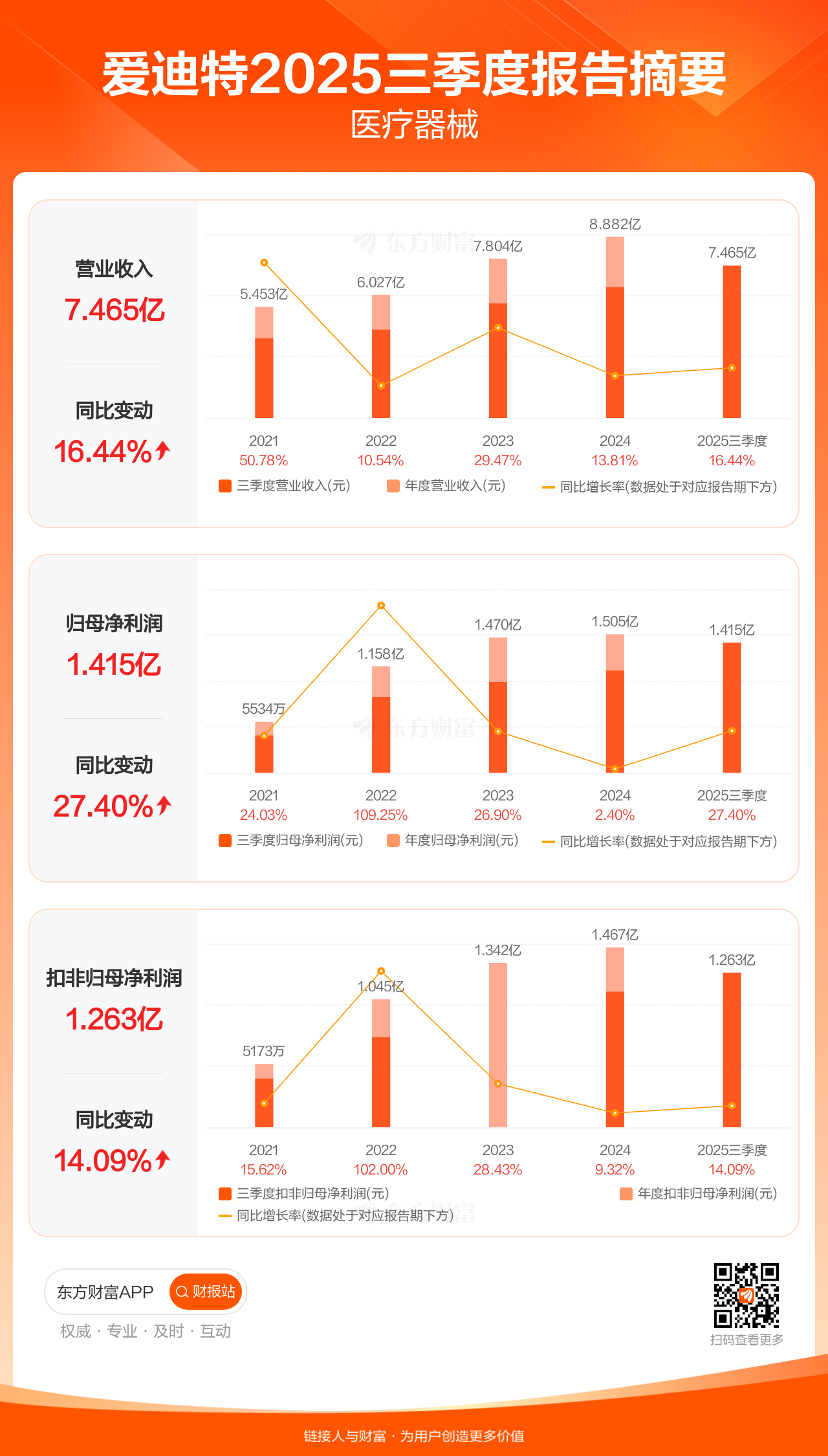 爱迪特10月29日发布2025年三季报显示,公司前三季实现营业收入7.47亿元,同比增长16.44%;归母净利润1.42亿元,同比增长27.40%;扣非归母净利润1.26亿元,同比增长14.09%。