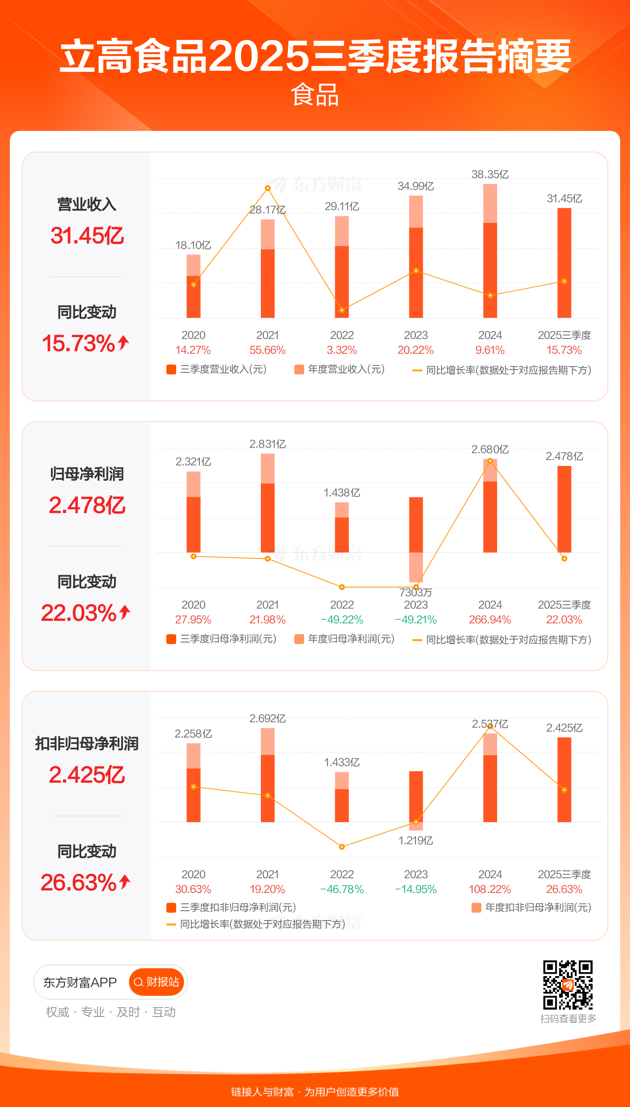 立高食品10月29日发布2025年三季报显示,公司前三季实现营业收入31.45亿元,同比增长15.73%;归母净利润2.48亿元,同比增长22.03%;扣非归母净利润2.42亿元,同比增长26.63%。