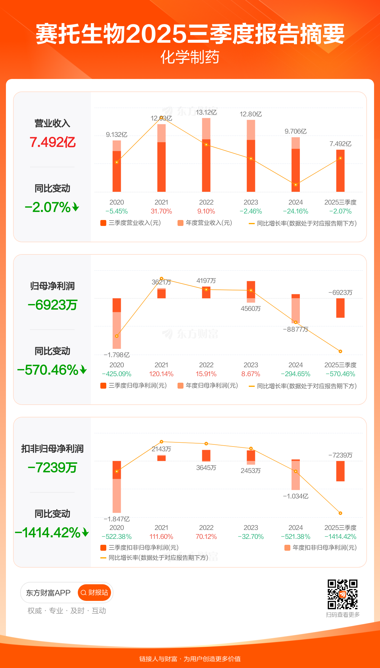 赛托生物10月29日发布2025年三季报显示,公司前三季实现营业收入7.49亿元,同比下滑2.07%;归母净利润-6923.03万元;扣非归母净利润-7238.79万元。