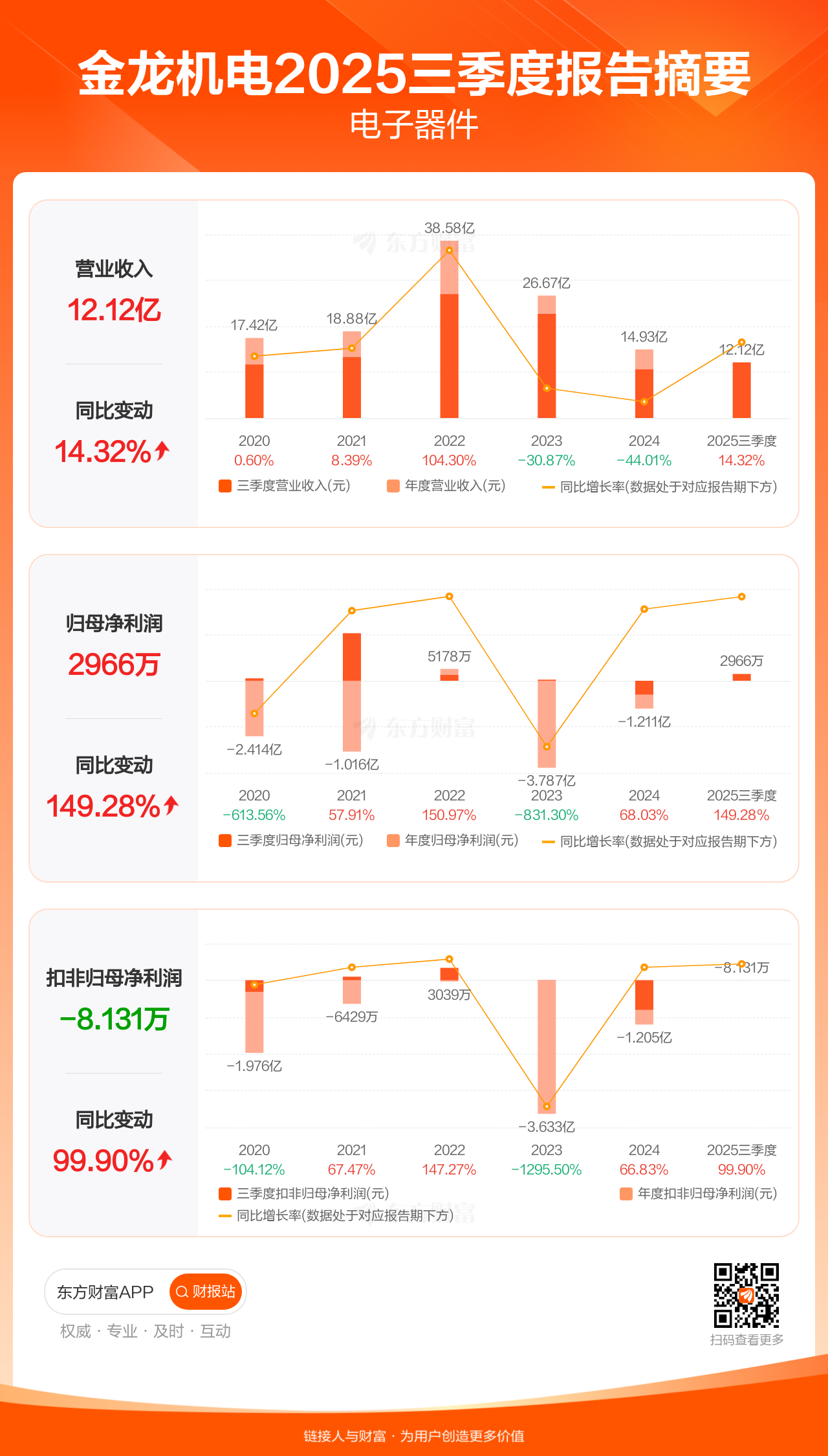 金龙机电10月29日发布2025年三季报显示,公司前三季实现营业收入12.12亿元,同比增长14.32%;归母净利润2966.25万元,同比增长149.28%;扣非归母净利润-8.13万元。