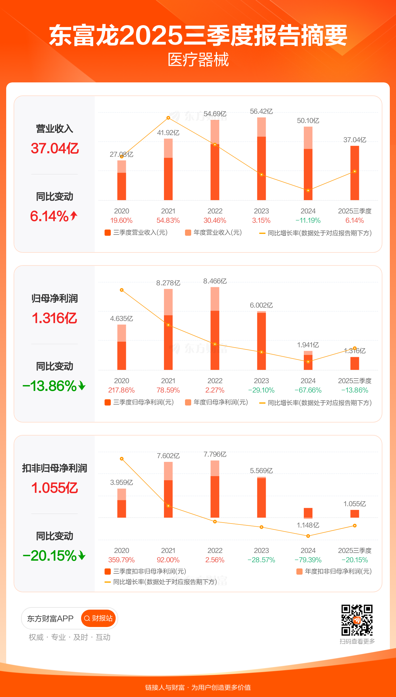 东富龙10月29日发布2025年三季报显示,公司前三季实现营业收入37.04亿元,同比增长6.14%;归母净利润1.32亿元,同比下滑13.86%;扣非归母净利润1.05亿元,同比下滑20.15%。