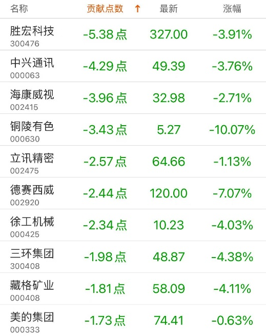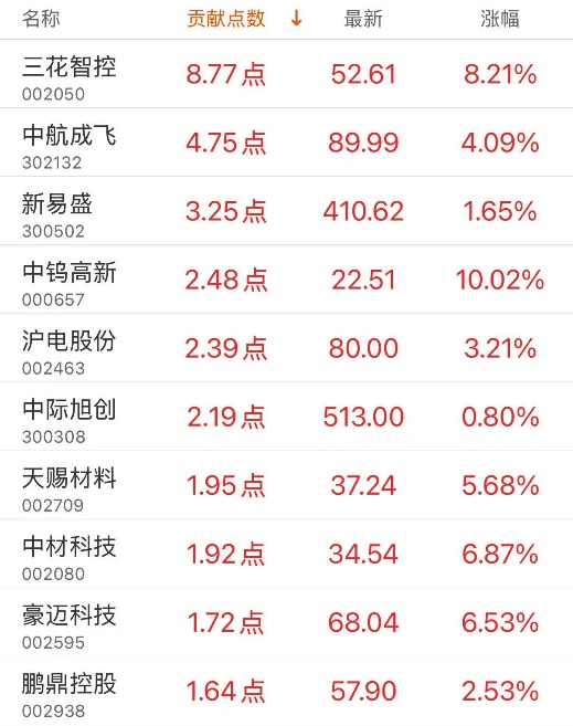 指数贡献榜:三花智控贡献8.77点