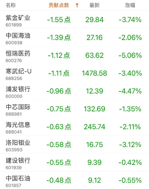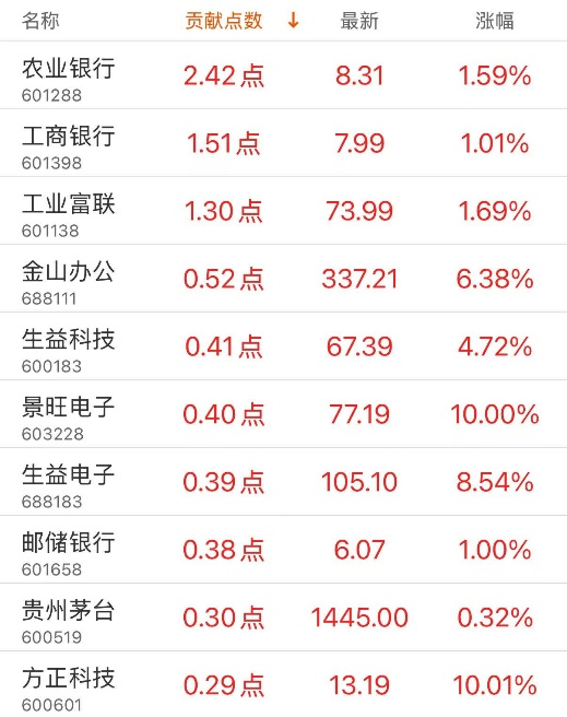 对上证指数贡献点数最多的个股是农业银行,贡献2.42点,该股当日涨1.59%,收盘价8.31元;拖累点数最多的个股是紫金矿业,拖累1.55点,该股当日跌3.74%,收盘价29.84元。