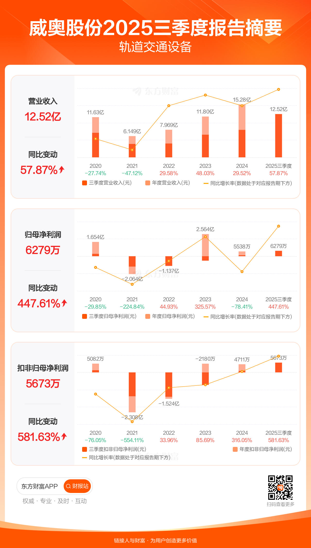 威奥股份10月29日发布2025年三季报显示,公司前三季实现营业收入12.52亿元,同比增长57.87%;归母净利润6278.56万元,同比增长447.61%;扣非归母净利润5672.73万元,同比增长581.63%。