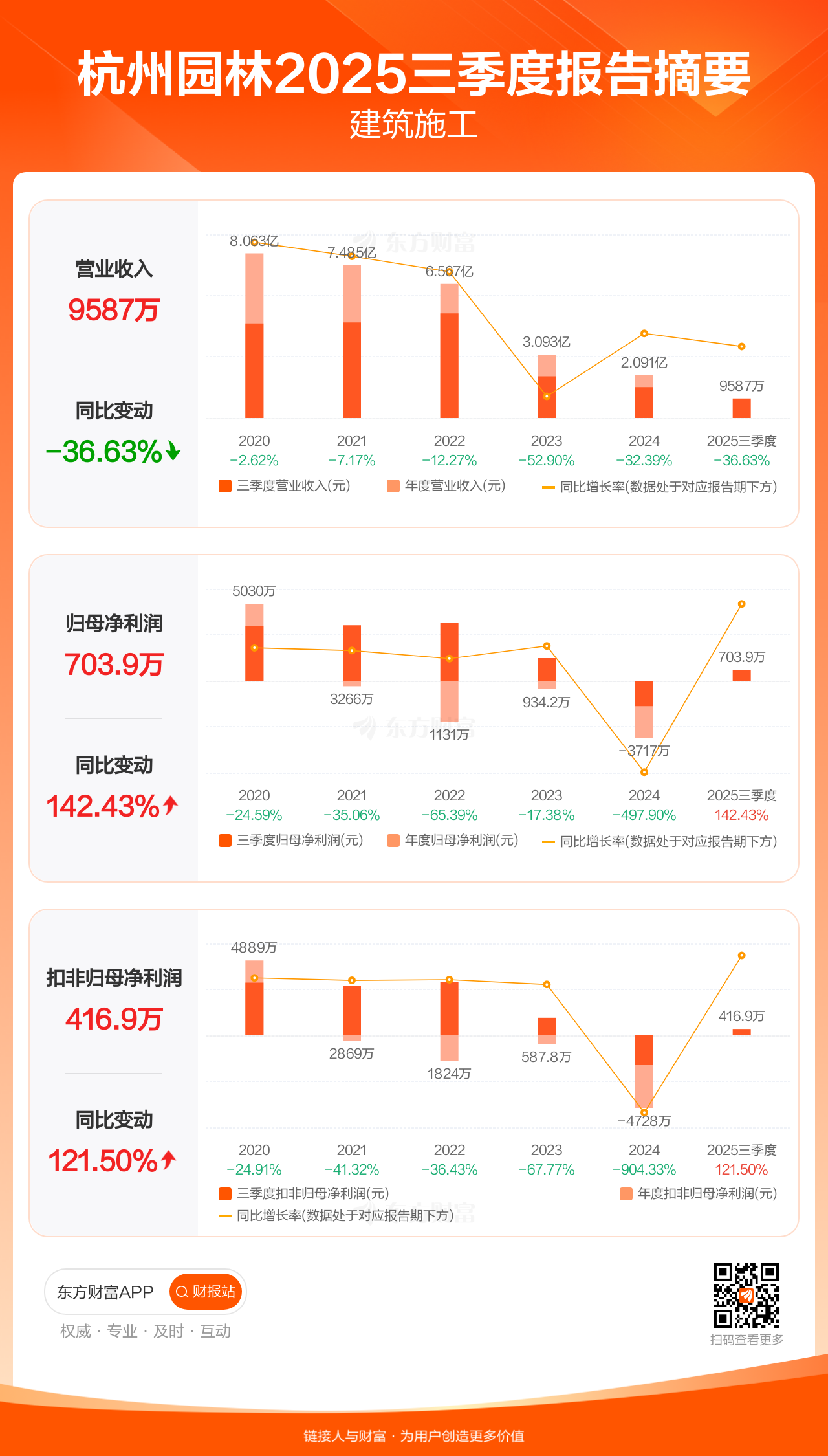 杭州园林10月29日发布2025年三季报显示,公司前三季实现营业收入9587.14万元,同比下滑36.63%;归母净利润703.93万元,同比增长142.43%;扣非归母净利润416.95万元,同比增长121.50%。