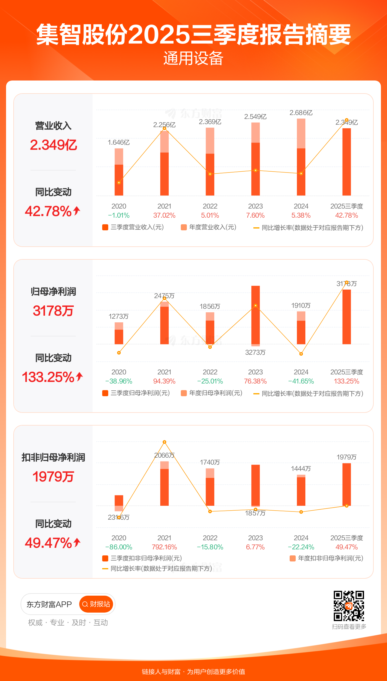 集智股份10月29日发布2025年三季报显示,公司前三季实现营业收入2.35亿元,同比增长42.78%;归母净利润3177.63万元,同比增长133.25%;扣非归母净利润1979.22万元,同比增长49.47%。