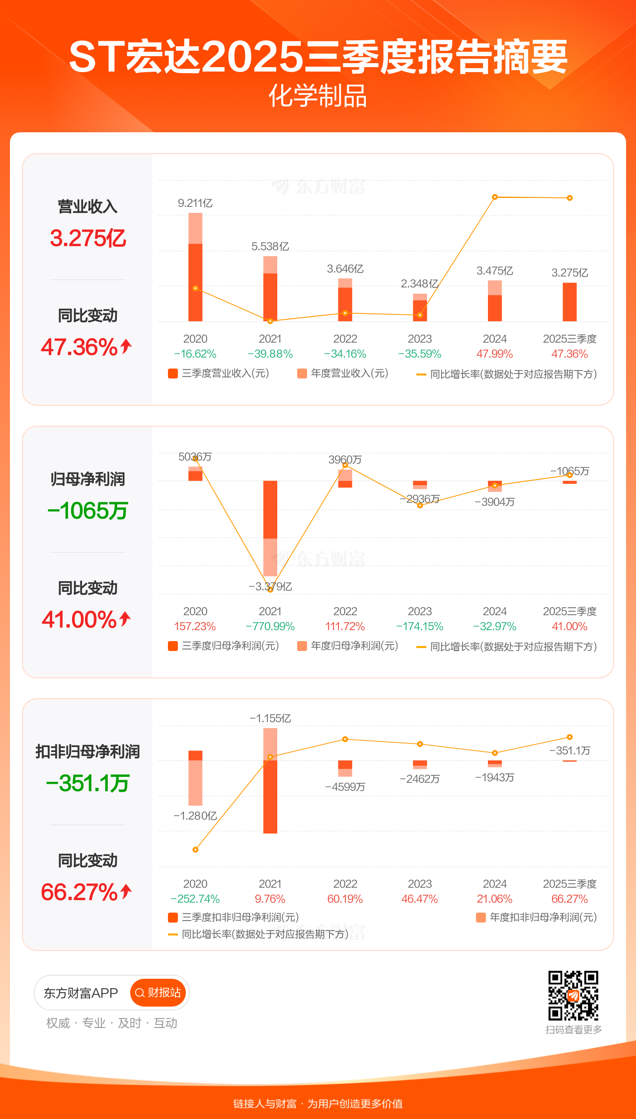 ST宏达10月29日发布2025年三季报显示,公司前三季实现营业收入3.28亿元,同比增长47.36%;归母净利润-1065.38万元;扣非归母净利润-351.13万元。