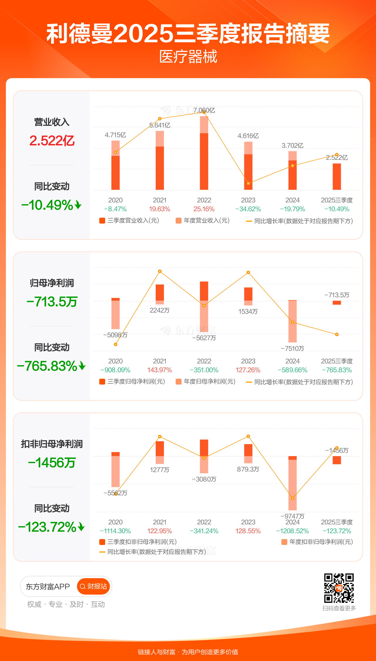 利德曼10月29日发布2025年三季报显示,公司前三季实现营业收入2.52亿元,同比下滑10.49%;归母净利润-713.48万元;扣非归母净利润-1456.13万元。