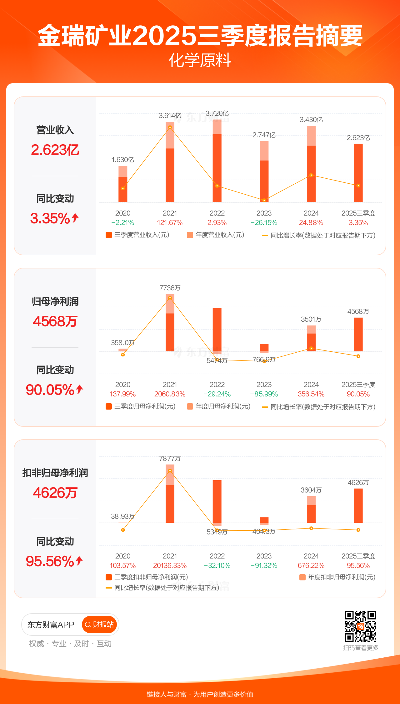 金瑞矿业10月29日发布2025年三季报显示,公司前三季实现营业收入2.62亿元,同比增长3.35%;归母净利润4567.87万元,同比增长90.05%;扣非归母净利润4625.96万元,同比增长95.56%。