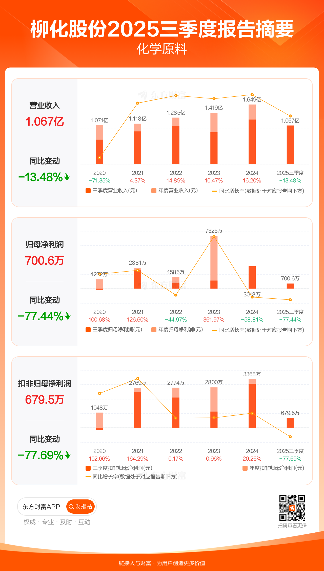 柳化股份10月29日发布2025年三季报显示,公司前三季实现营业收入1.07亿元,同比下滑13.48%;归母净利润700.57万元,同比下滑77.44%;扣非归母净利润679.51万元,同比下滑77.69%。