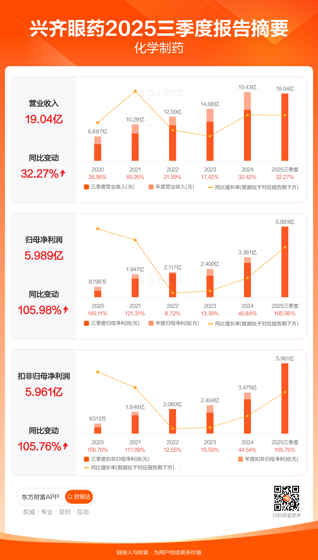 兴齐眼药10月29日发布2025年三季报显示,公司前三季实现营业收入19.04亿元,同比增长32.27%;归母净利润5.99亿元,同比增长105.98%;扣非归母净利润5.96亿元,同比增长105.76%。