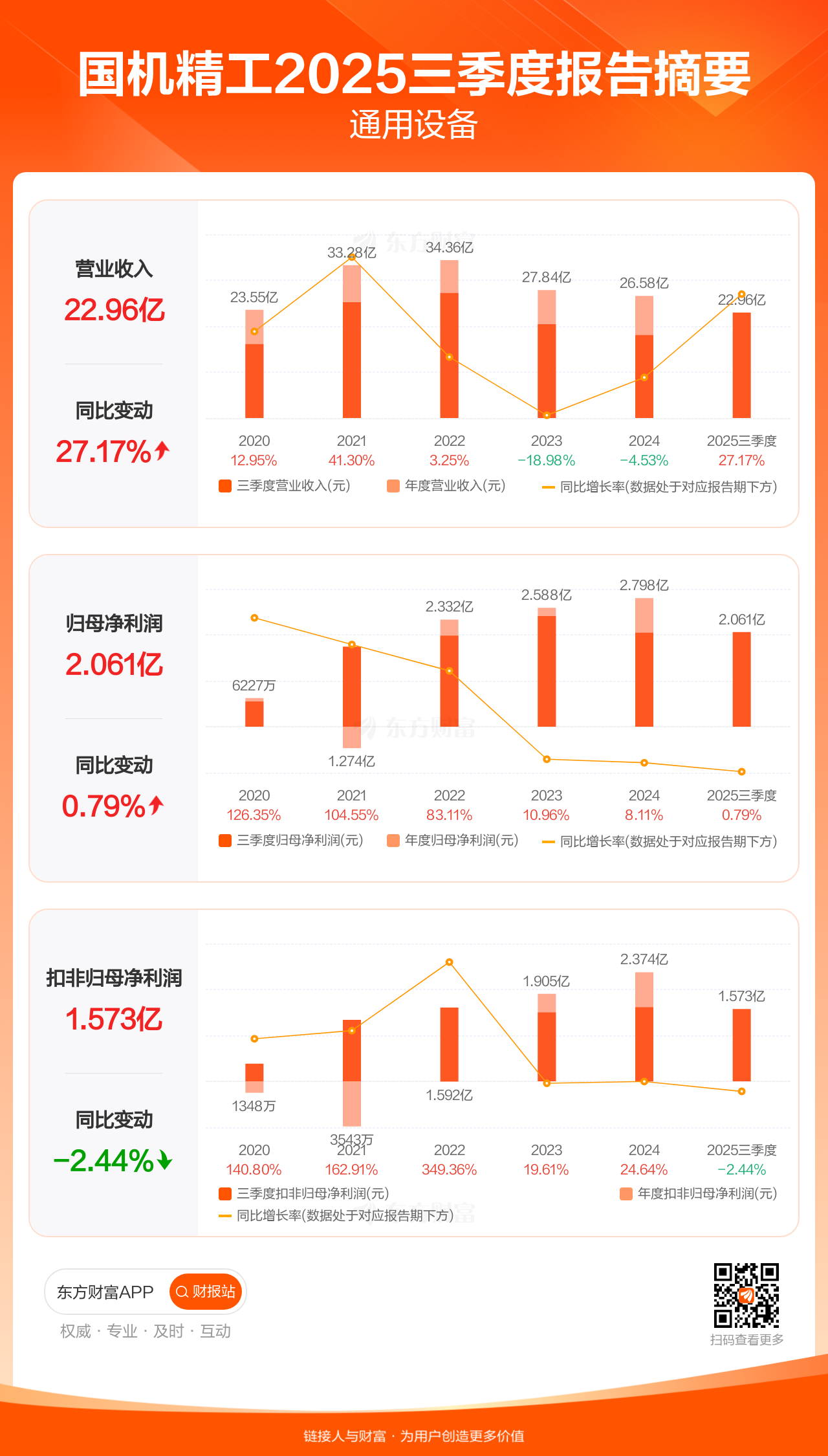 国机精工10月29日发布2025年三季报显示,公司前三季实现营业收入22.96亿元,同比增长27.17%;归母净利润2.06亿元,同比增长0.79%;扣非归母净利润1.57亿元,同比下滑2.44%