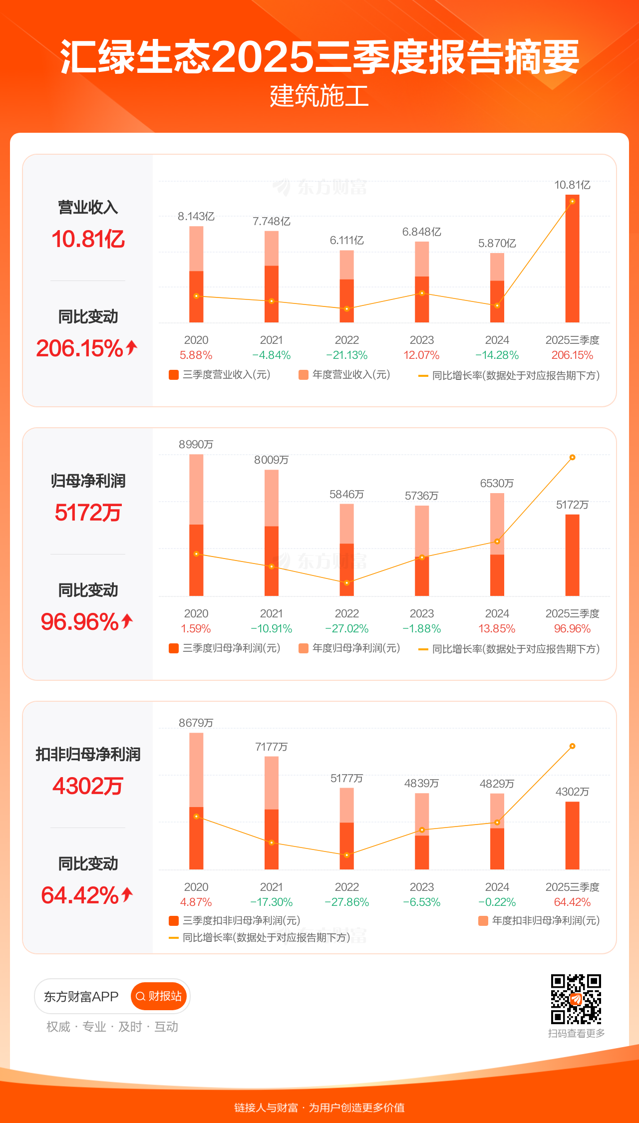 汇绿生态10月29日发布2025年三季报显示,公司前三季实现营业收入10.81亿元,同比增长206.15%;归母净利润5171.88万元,同比增长96.96%;扣非归母净利润4301.94万元,同比增长64.42%。
