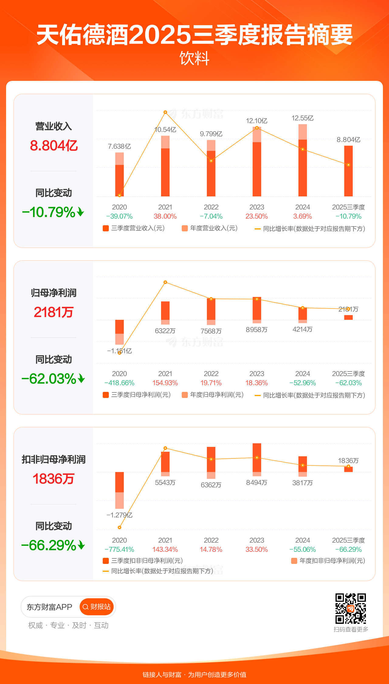 天佑德酒10月27日发布2025年三季报显示,公司前三季实现营业收入8.80亿元,同比下滑10.79%;归母净利润2181.40万元,同比下滑62.03%;扣非归母净利润1835.76万元,同比下滑66.29%。