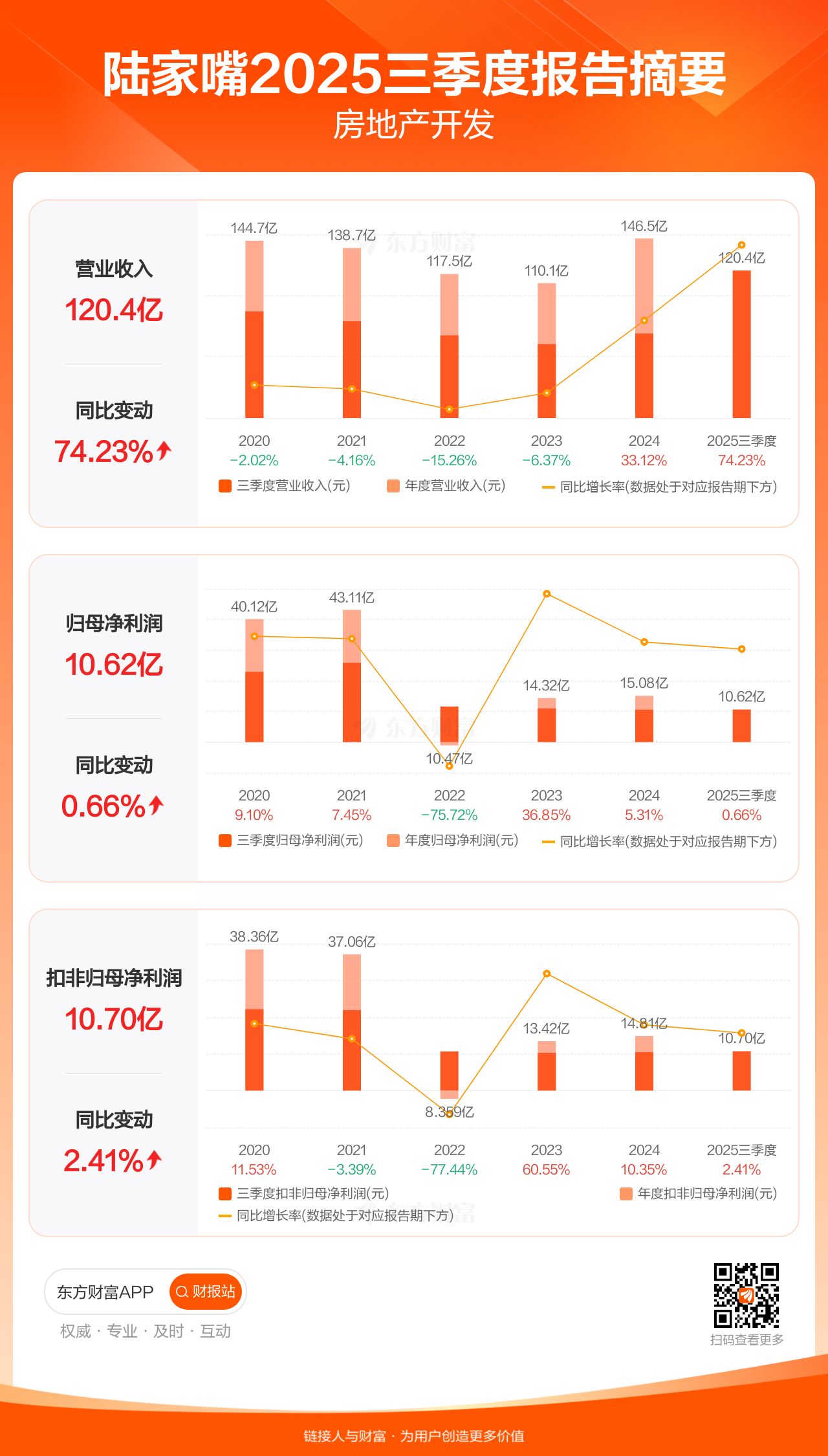 陆家嘴10月29日发布2025年三季报显示,公司前三季实现营业收入120.38亿元,同比增长74.23%;归母净利润10.62亿元,同比增长0.66%;扣非归母净利润10.70亿元,同比增长2.41%。