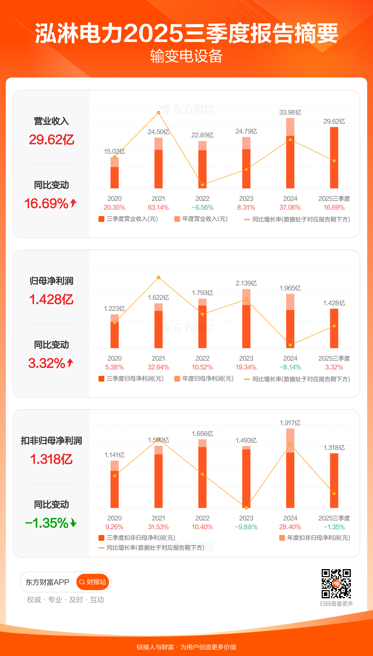 泓淋电力10月29日发布2025年三季报显示,公司前三季实现营业收入29.62亿元,同比增长16.69%;归母净利润1.43亿元,同比增长3.32%;扣非归母净利润1.32亿元,同比下滑1.35%。