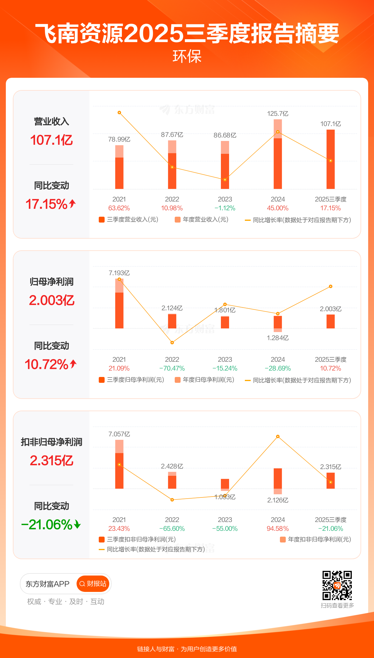 飞南资源10月29日发布2025年三季报显示,公司前三季实现营业收入107.07亿元,同比增长17.15%;归母净利润2.00亿元,同比增长10.72%;扣非归母净利润2.32亿元,同比下滑21.06%。