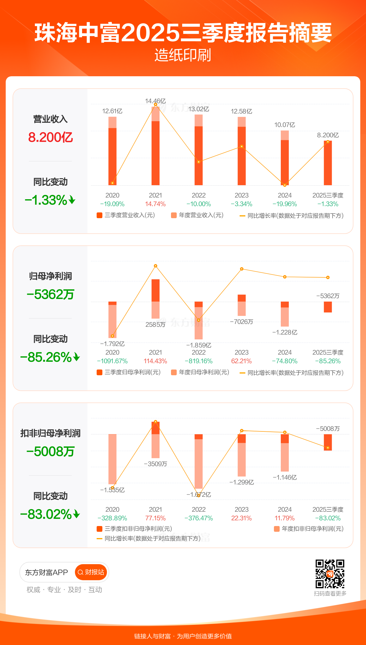 珠海中富10月29日发布2025年三季报显示,公司前三季实现营业收入8.20亿元,同比下滑1.33%;归母净利润-5362.21万元;扣非归母净利润-5007.69万元。