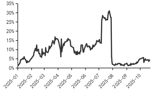 需求端韧性较强,主要增量来源于中国。根据国际铜研究组织(ICSG)数据,2025年1—8月全球精炼铜消费量为1883.40万吨,同比增长5.90%。其中,中国精炼铜终端消费量为1061.72万吨,同比增长11.05%。10月沪铜价格站上80000元/吨,对下游需求释放产生一定抑制作用。但对比前几轮沪铜价格站上80000元/吨时下游的表现,本轮下游市场的负反馈相对温和,现货仍维持升水,与前几轮的贴水状态形成鲜明对比。整体来看,随着供应趋紧逐渐成为市场共识,下游对铜价的心理价位上限逐步上移。
