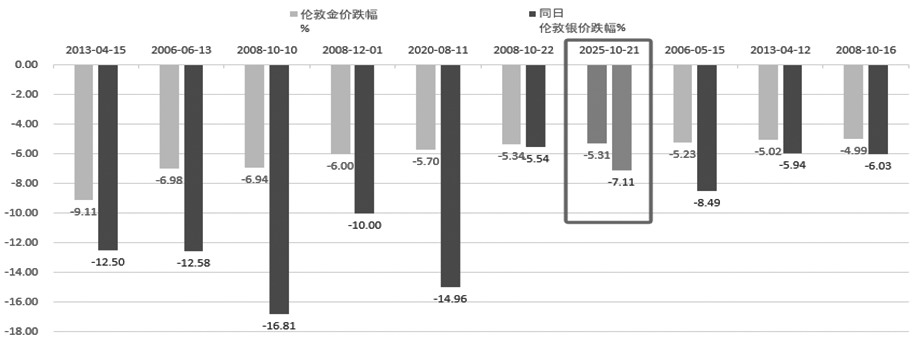 其次,从历史角度看,本轮金价大跌处于什么水平?笔者整理了伦敦现货金价的历史数据,2025年10月21日金价跌幅5.31%,位居2000年以来金价日跌幅榜第七,而其他金价日跌幅超过本次的情况均发生在“危机时刻”,如2008年金融危机和2020年疫情期间。不过,拉长时间来看,1970年以来,本次金价单日跌幅仅排第37名。有意思的是,每次金价的大跌均伴随着银价更大幅度的下挫。
