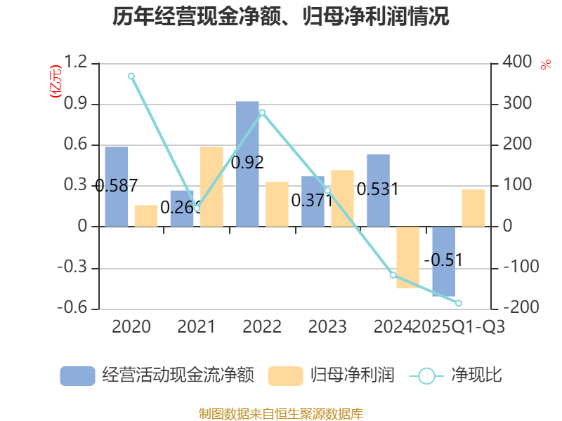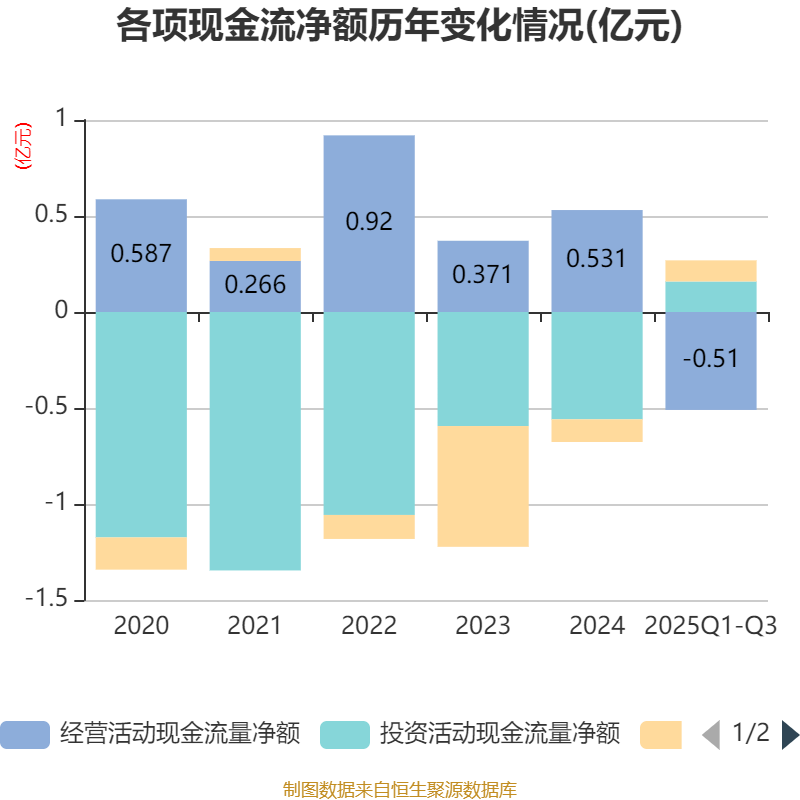 2025年前三季度,公司经营活动现金流净额为-5101.01万元,同比减少8830.02万元;筹资活动现金流净额1102.76万元,同比增加2228.91万元;投资活动现金流净额1590.01万元,上年同期为-5820.07万元。