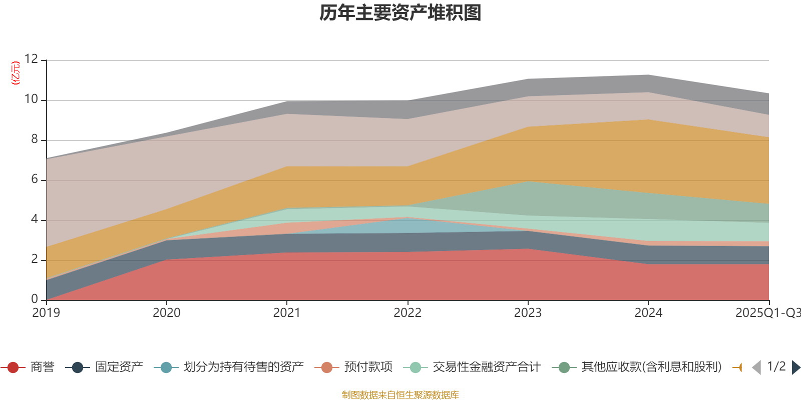 资产重大变化方面,截至2025年三季度末,公司其他应收款(含利息和股利)较上年末减少27.56%,占公司总资产比重下降2.44个百分点;商誉较上年末没有变化,占公司总资产比重上升1.43个百分点;货币资金较上年末减少17.78%,占公司总资产比重下降1.25个百分点;交易性金融资产合计较上年末减少15.9%,占公司总资产比重下降0.8个百分点。