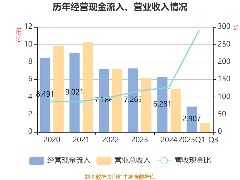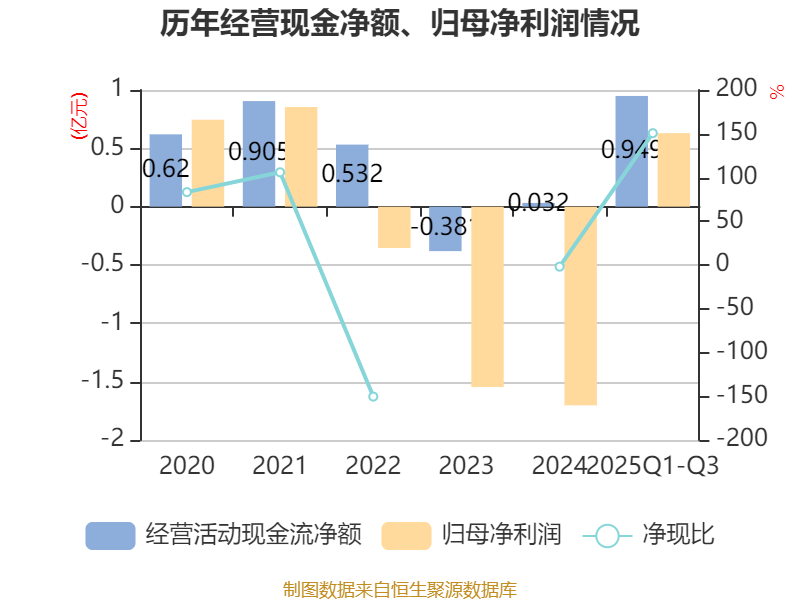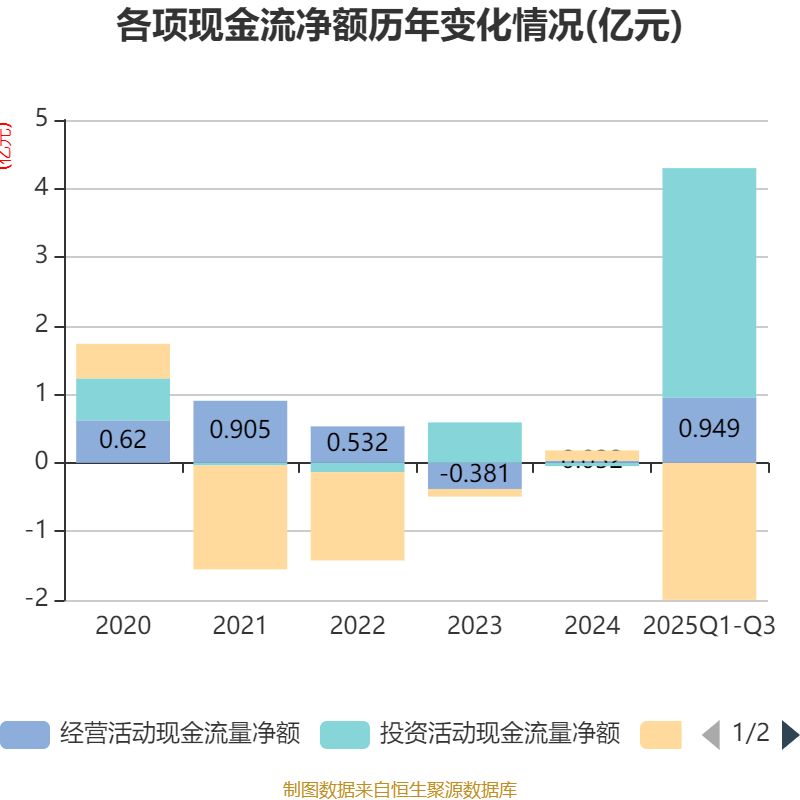 2025年前三季度,公司经营活动现金流净额为9492.09万元,同比增长1799.71%;筹资活动现金流净额-2亿元,同比减少1.48亿元;投资活动现金流净额3.35亿元,上年同期为-127.38万元。