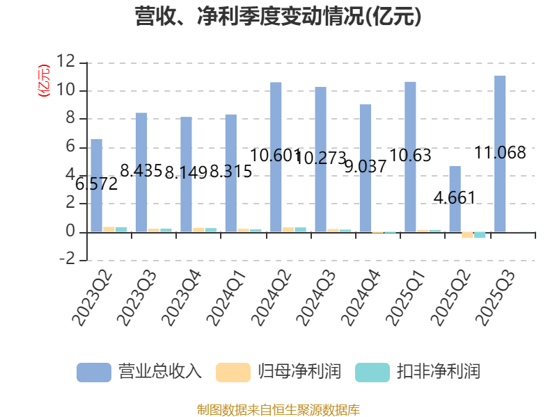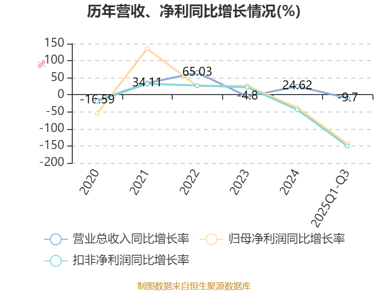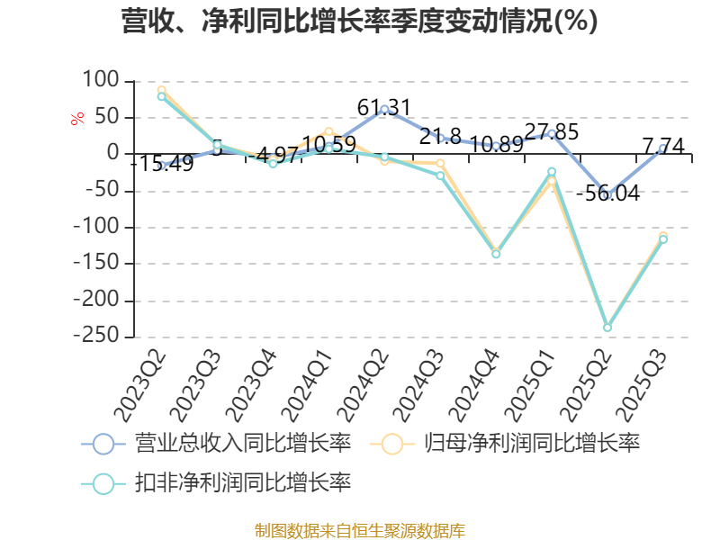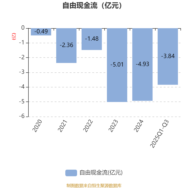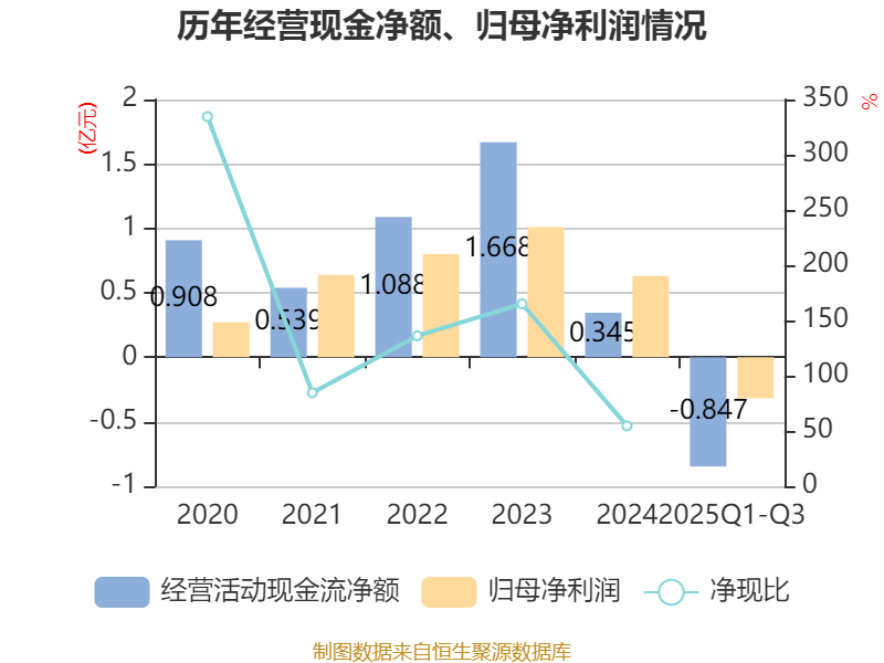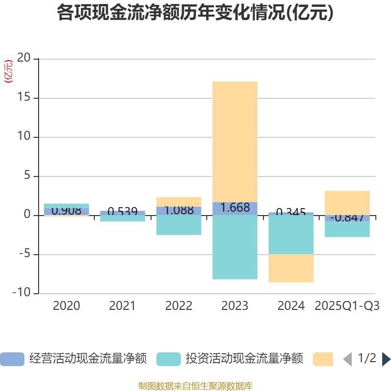 2025年前三季度,公司经营活动现金流净额为-8468.34万元,同比减少1.55亿元;筹资活动现金流净额3.08亿元,同比增加6.95亿元;投资活动现金流净额-1.98亿元,上年同期为-4亿元。