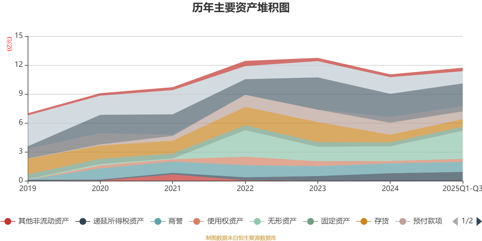 资产重大变化方面,截至2025年三季度末,公司无形资产较上年末增加92.14%,占公司总资产比重上升11.1个百分点;货币资金较上年末减少26.86%,占公司总资产比重下降4.88个百分点;预付款项较上年末减少35.12%,占公司总资产比重下降4.4个百分点;应收票据及应收账款较上年末减少2.31%,占公司总资产比重下降1.76个百分点。