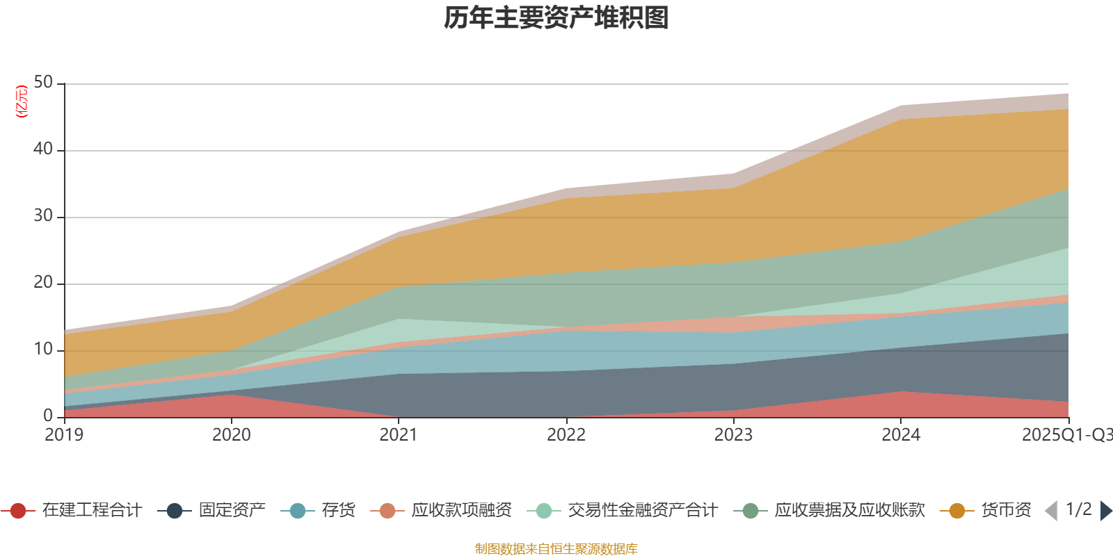 资产重大变化方面,截至2025年三季度末,公司货币资金较上年末减少34.82%,占公司总资产比重下降14.61个百分点;交易性金融资产合计较上年末增加133.33%,占公司总资产比重上升8.01个百分点;固定资产较上年末增加55.95%,占公司总资产比重上升7.05个百分点;在建工程合计较上年末减少39.99%,占公司总资产比重下降3.46个百分点。