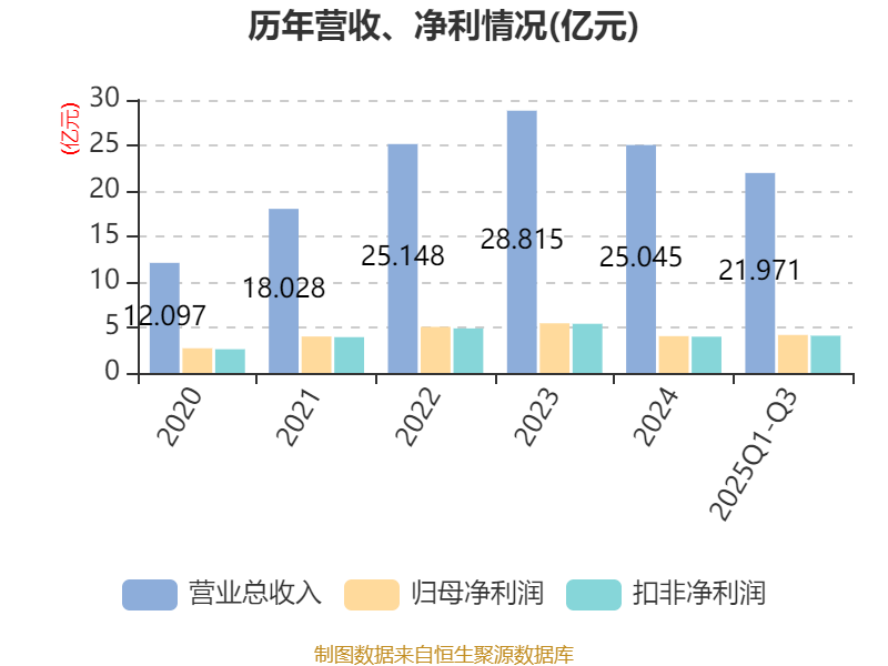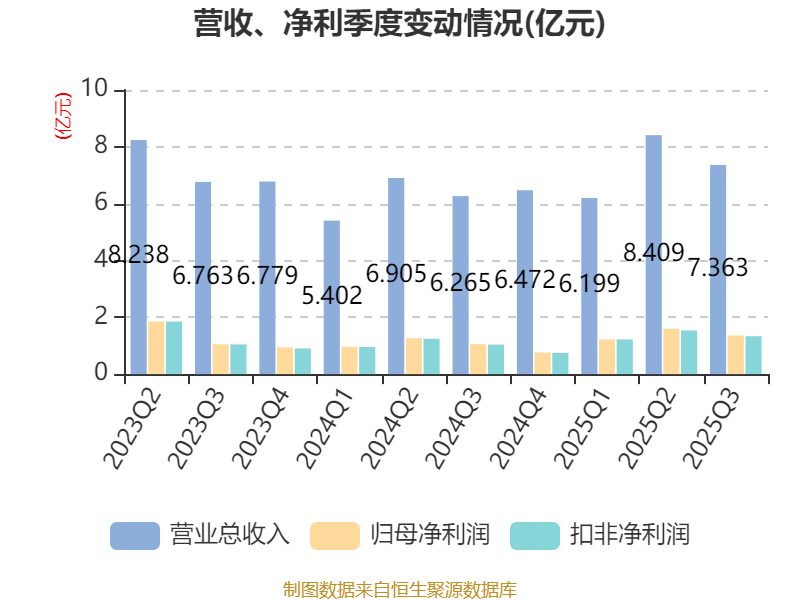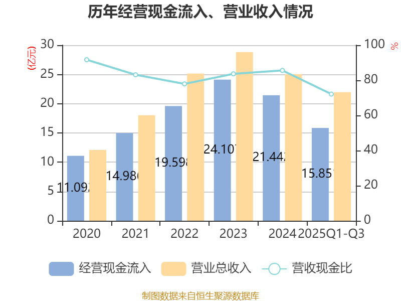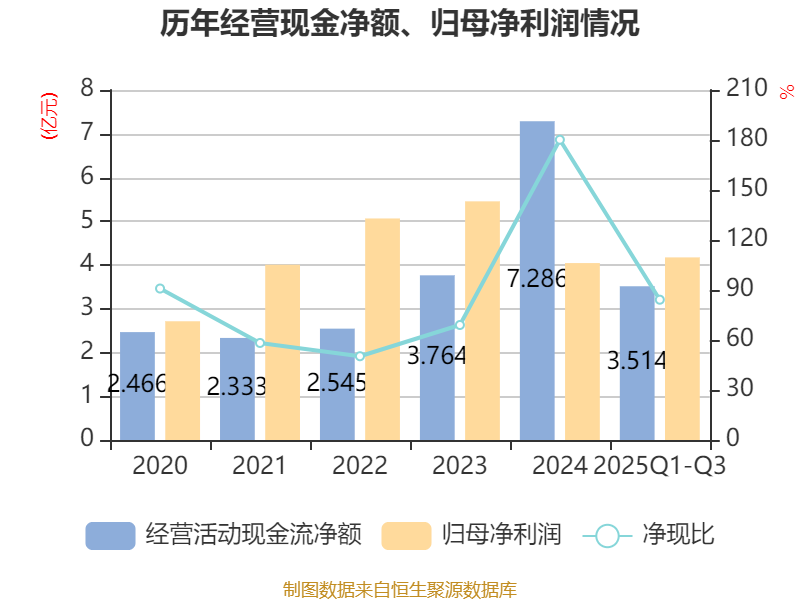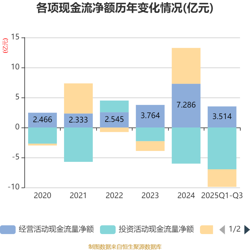 2025年前三季度,公司经营活动现金流净额为3.51亿元,同比下降42.38%;筹资活动现金流净额-2.92亿元,同比减少2561.01万元;投资活动现金流净额-6.97亿元,上年同期为-2.16亿元。