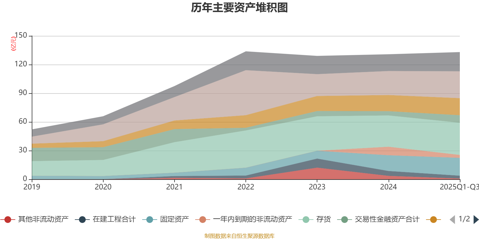 资产重大变化方面,截至2025年三季度末,公司一年内到期的非流动资产较上年末减少66.04%,占公司总资产比重下降4.55个百分点;交易性金融资产合计较上年末增加76.34%,占公司总资产比重上升2.52个百分点;其他非流动资产较上年末减少80.02%,占公司总资产比重下降2.18个百分点;货币资金较上年末增加12%,占公司总资产比重上升1.93个百分点。