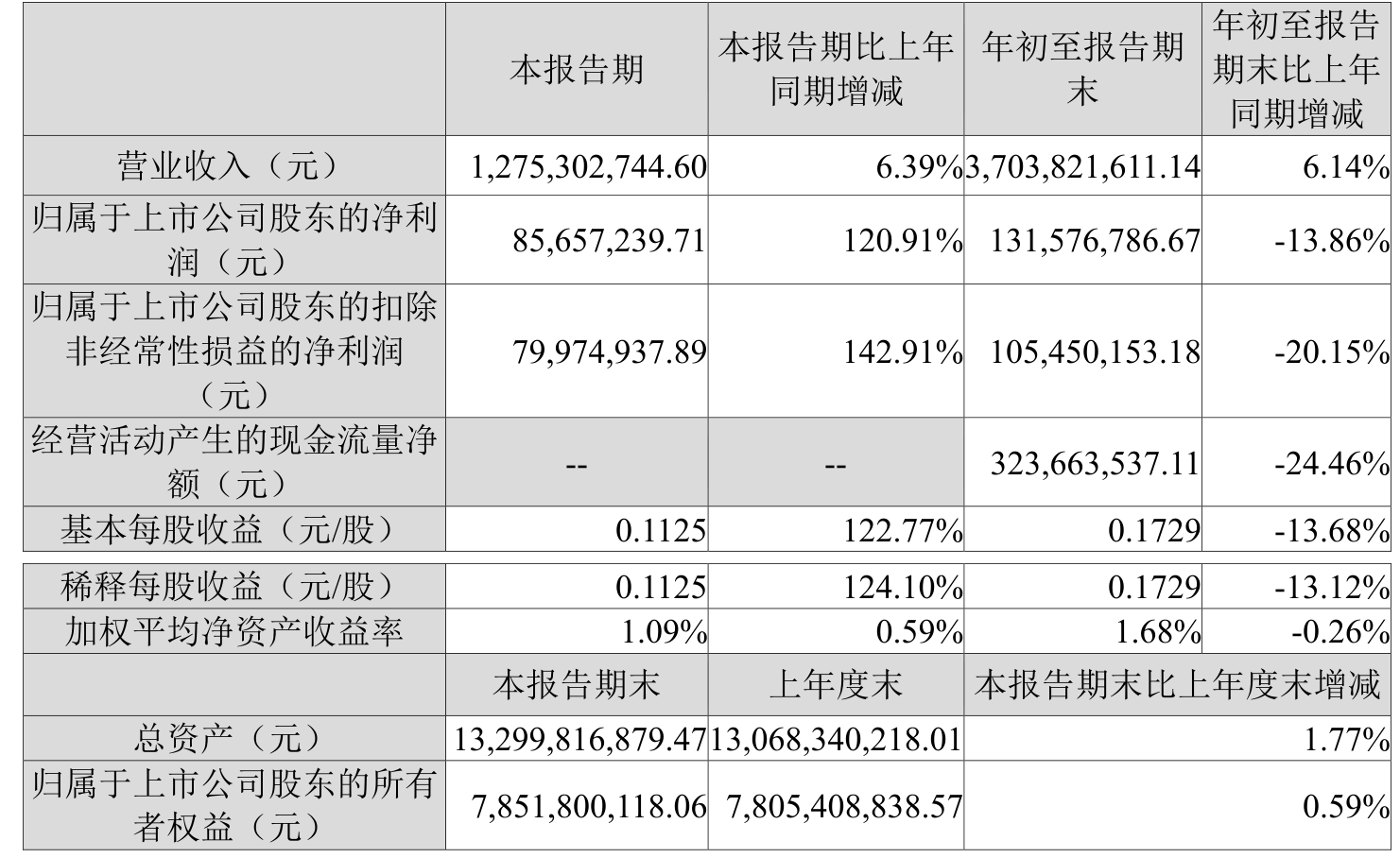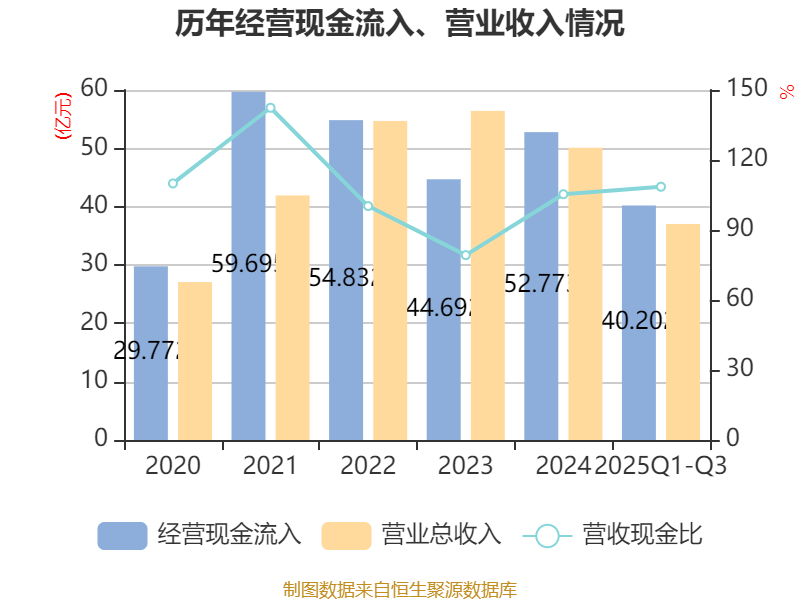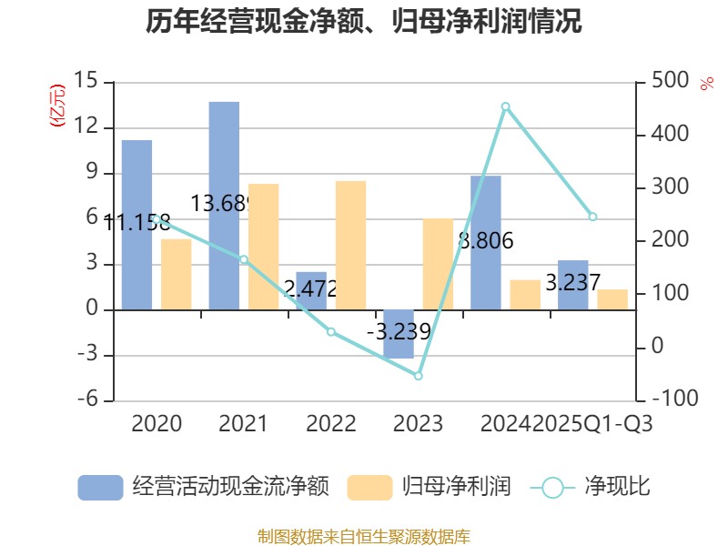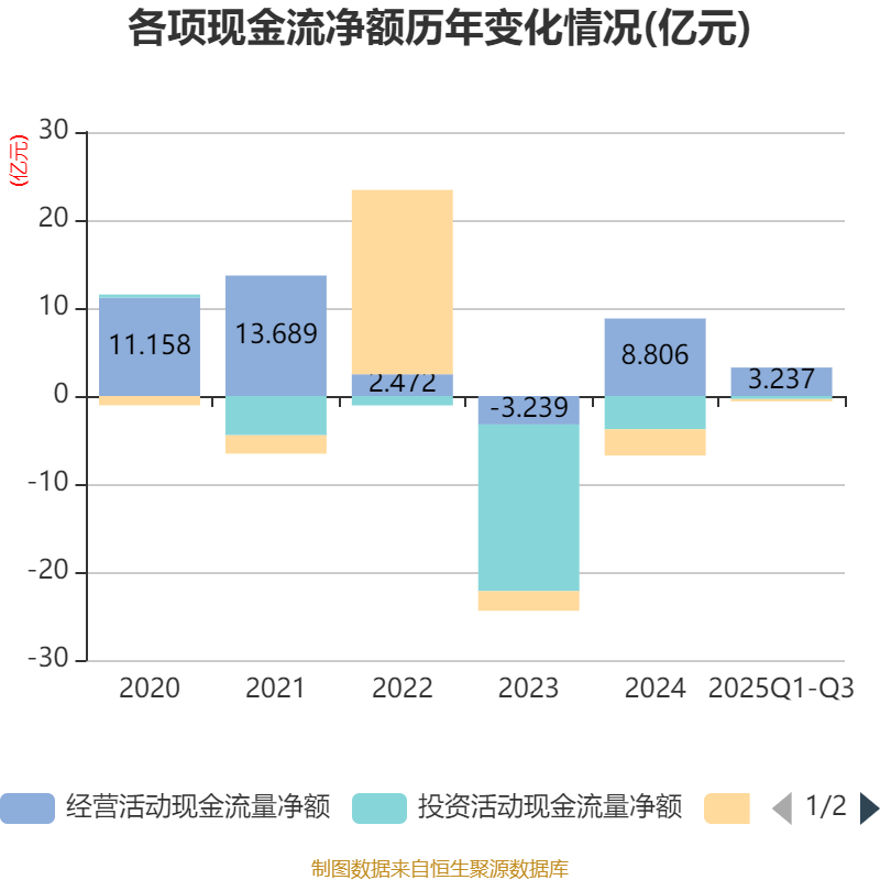2025年前三季度,公司经营活动现金流净额为3.24亿元,同比下降24.46%;筹资活动现金流净额-2555.07万元,同比增加1.89亿元;投资活动现金流净额-3484.91万元,上年同期为-5566.45万元。