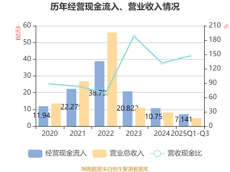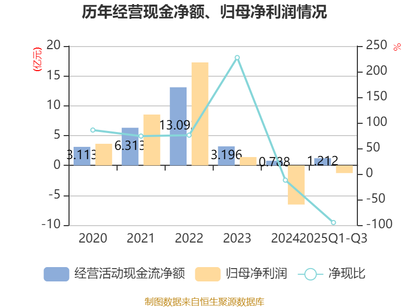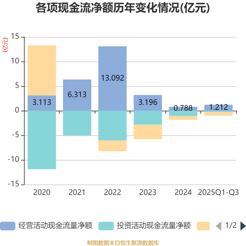 2025年前三季度,公司经营活动现金流净额为1.21亿元,同比增长173.06%;筹资活动现金流净额-7677.63万元,同比减少1058.89万元;投资活动现金流净额-2515.14万元,上年同期为1.68亿元。