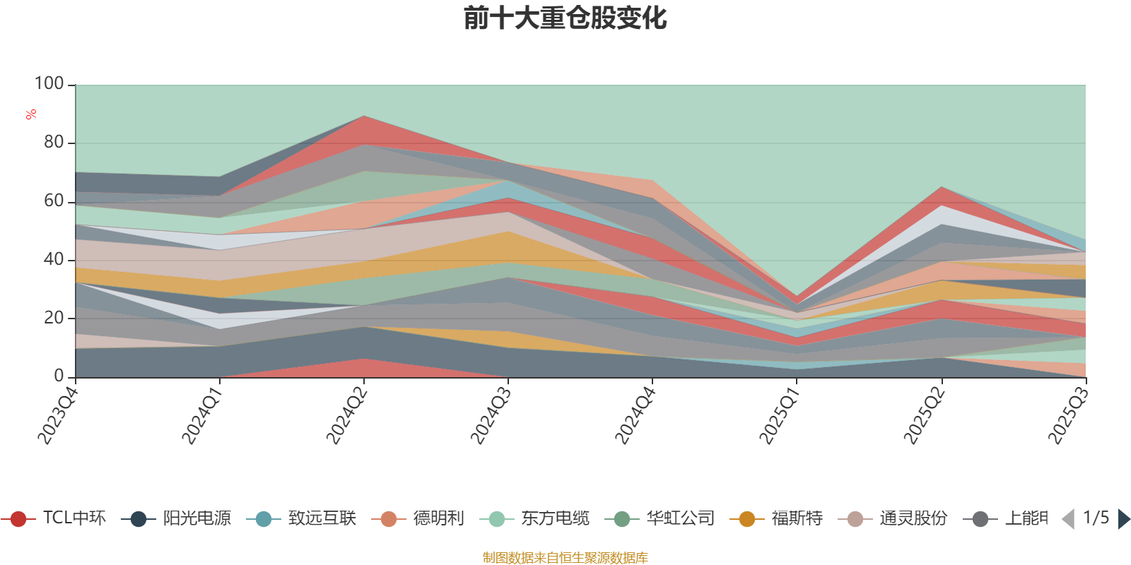 截至2025年三季度末,基金十大重仓股分别是艾罗能源、亿纬锂能、德明利、东方电缆、宁德时代、阿特斯、欣旺达、大金重工、华虹公司、北京君正。