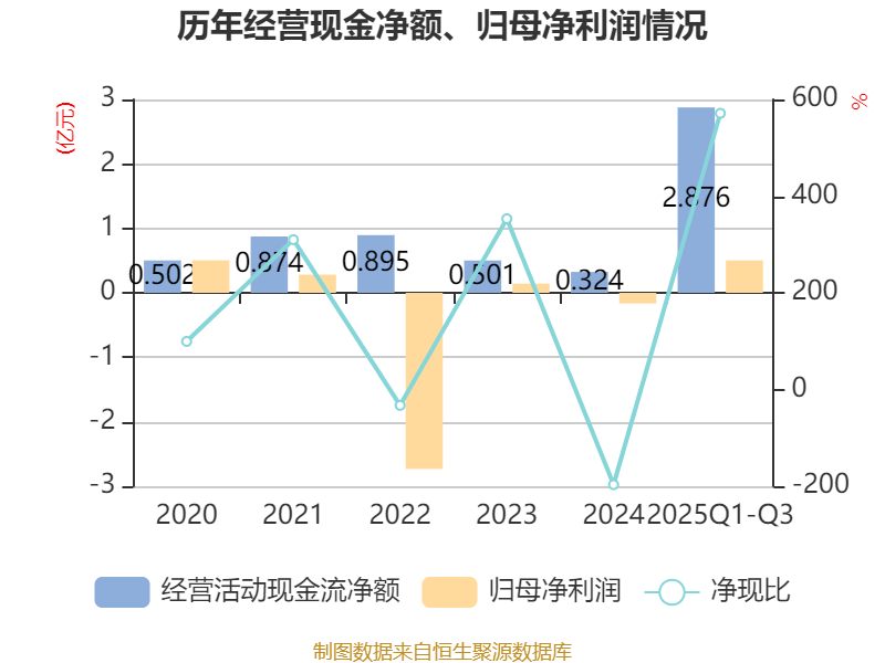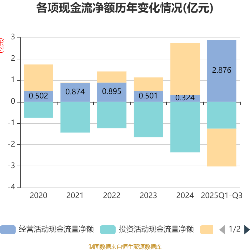 2025年前三季度,公司经营活动现金流净额为2.88亿元,同比增长409.97%;筹资活动现金流净额-1.76亿元,同比减少3.24亿元;投资活动现金流净额-1.25亿元,上年同期为-1.52亿元。