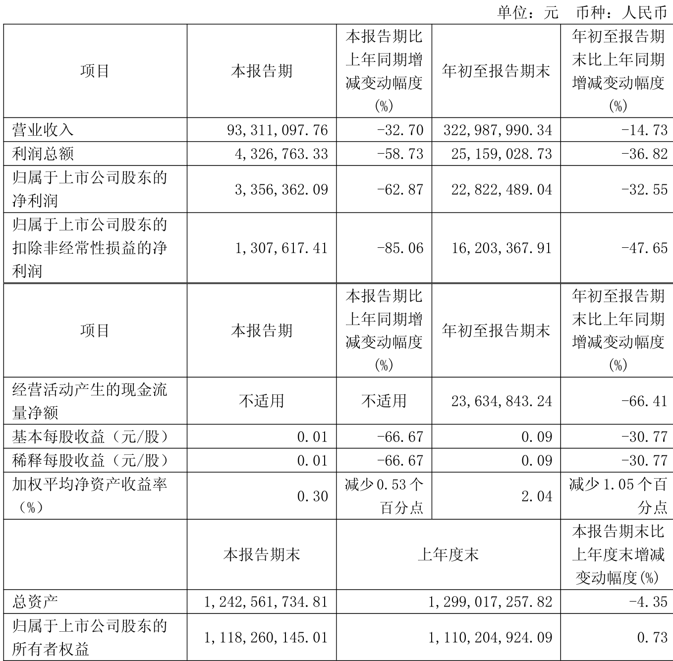中证智能财讯克来机电(603960)10月29日披露2025年第三季度报告。前三季度公司实现营业总收入3.23亿元,同比下降14.73%;归母净利润2282.25万元,同比下降32.55%;扣非净利润1620.34万元,同比下降47.65%;经营活动产生的现金流量净额为2363.48万元,同比下降66.41%;报告期内,克来机电基本每股收益为0.09元,加权平均净资产收益率为2.04%。